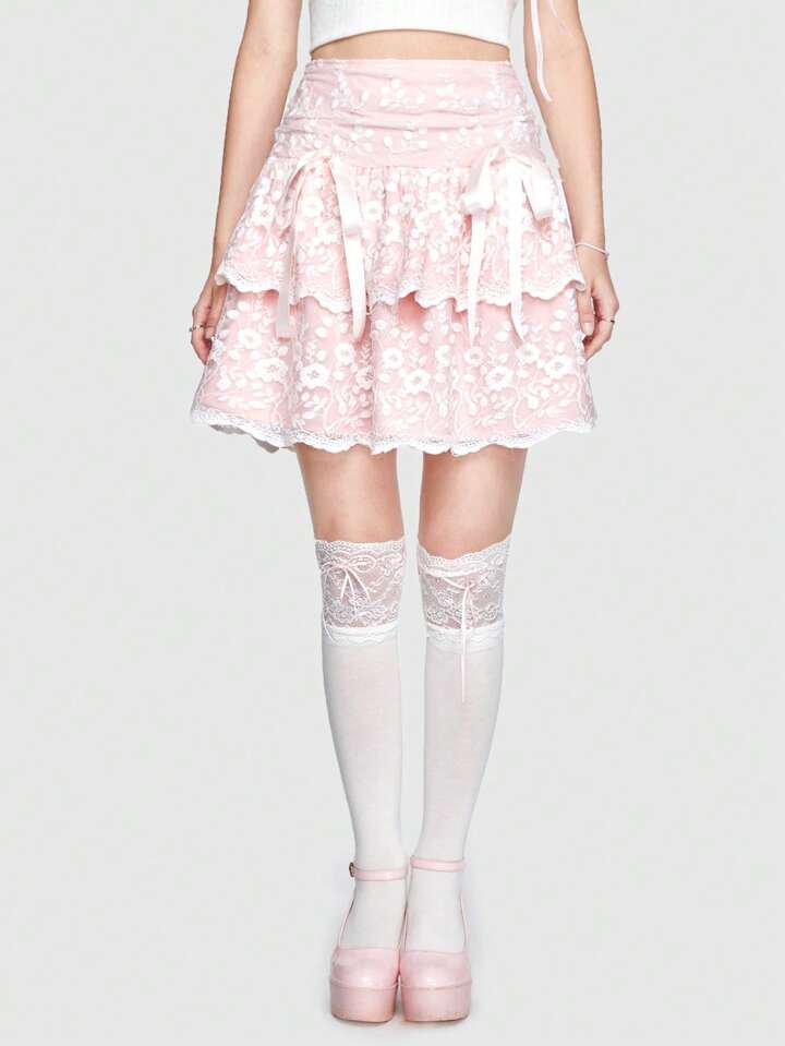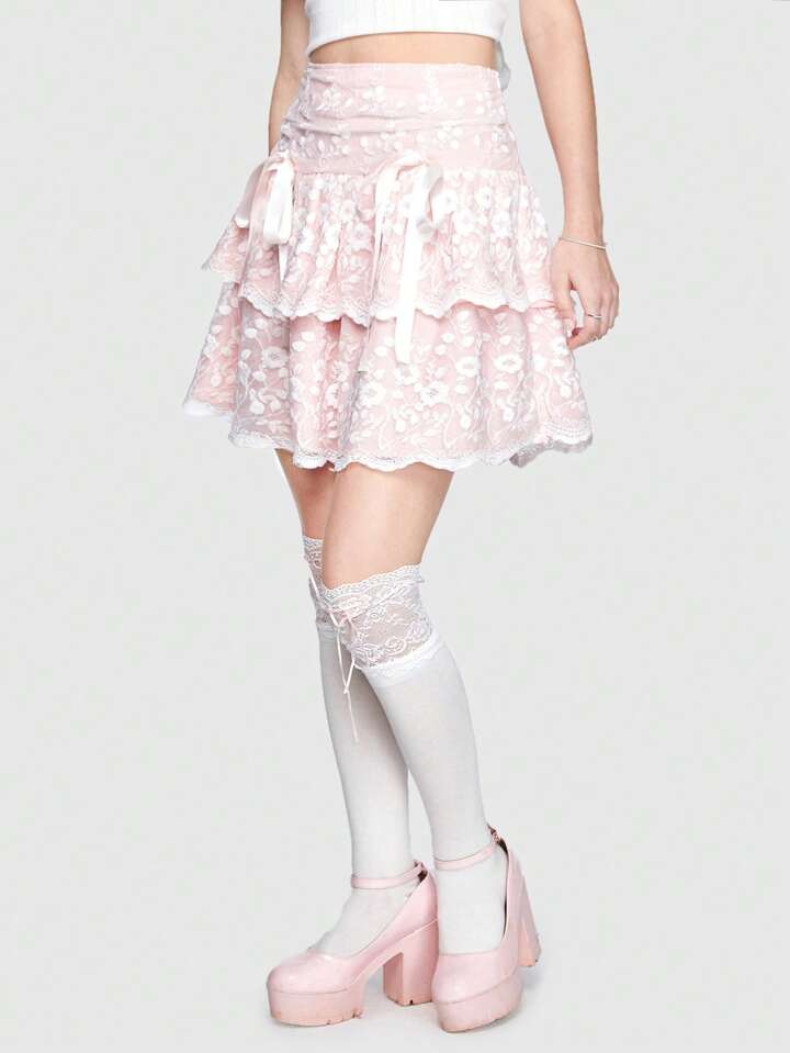 Kawaii Floral Lace Ruffle Trim Bow Front Layer Hem Skirt