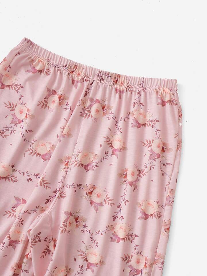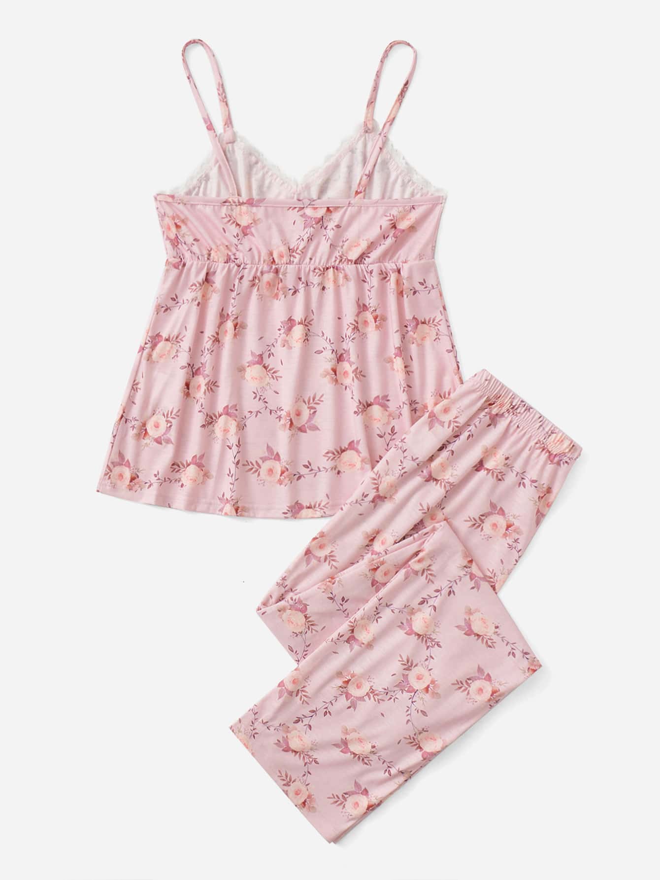 Kawaii Floral Print Contrast Lace Cami Top & Pants Lounge Set