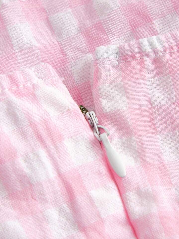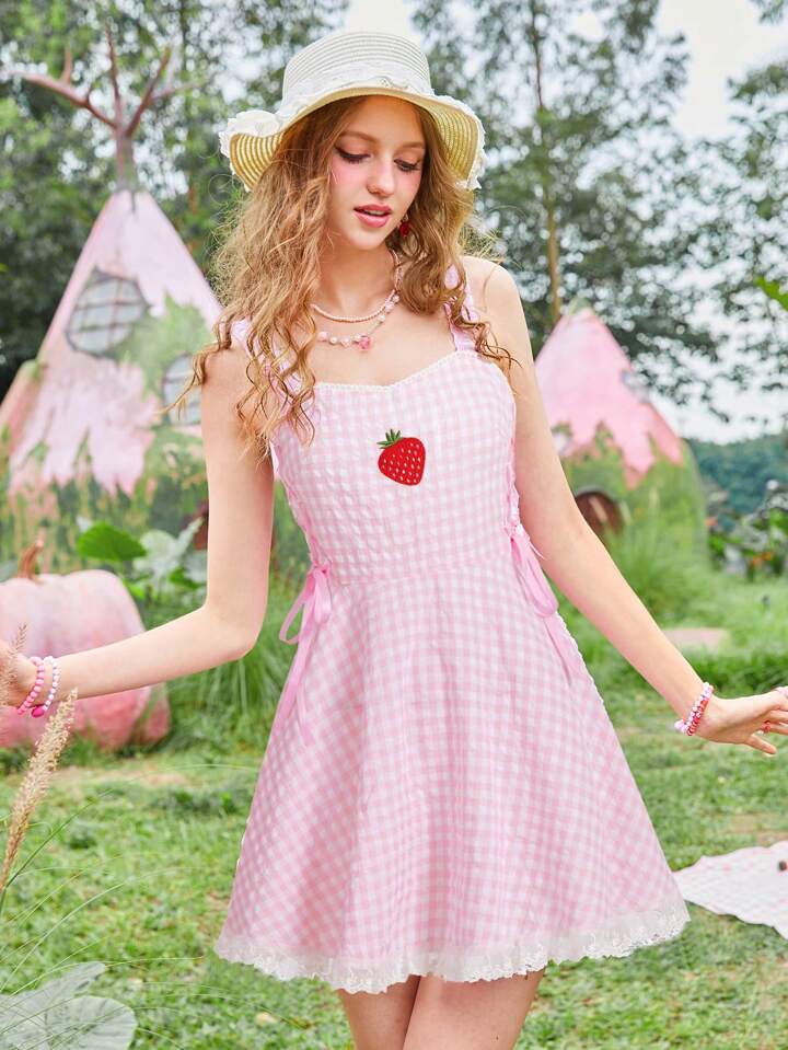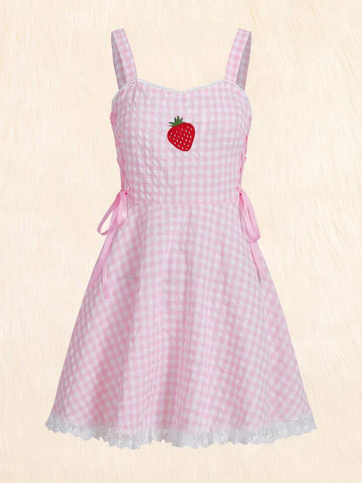 Kawaii Gingham Print Strawberry Embroidery Lace Trim Cami Dress
