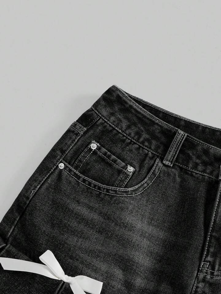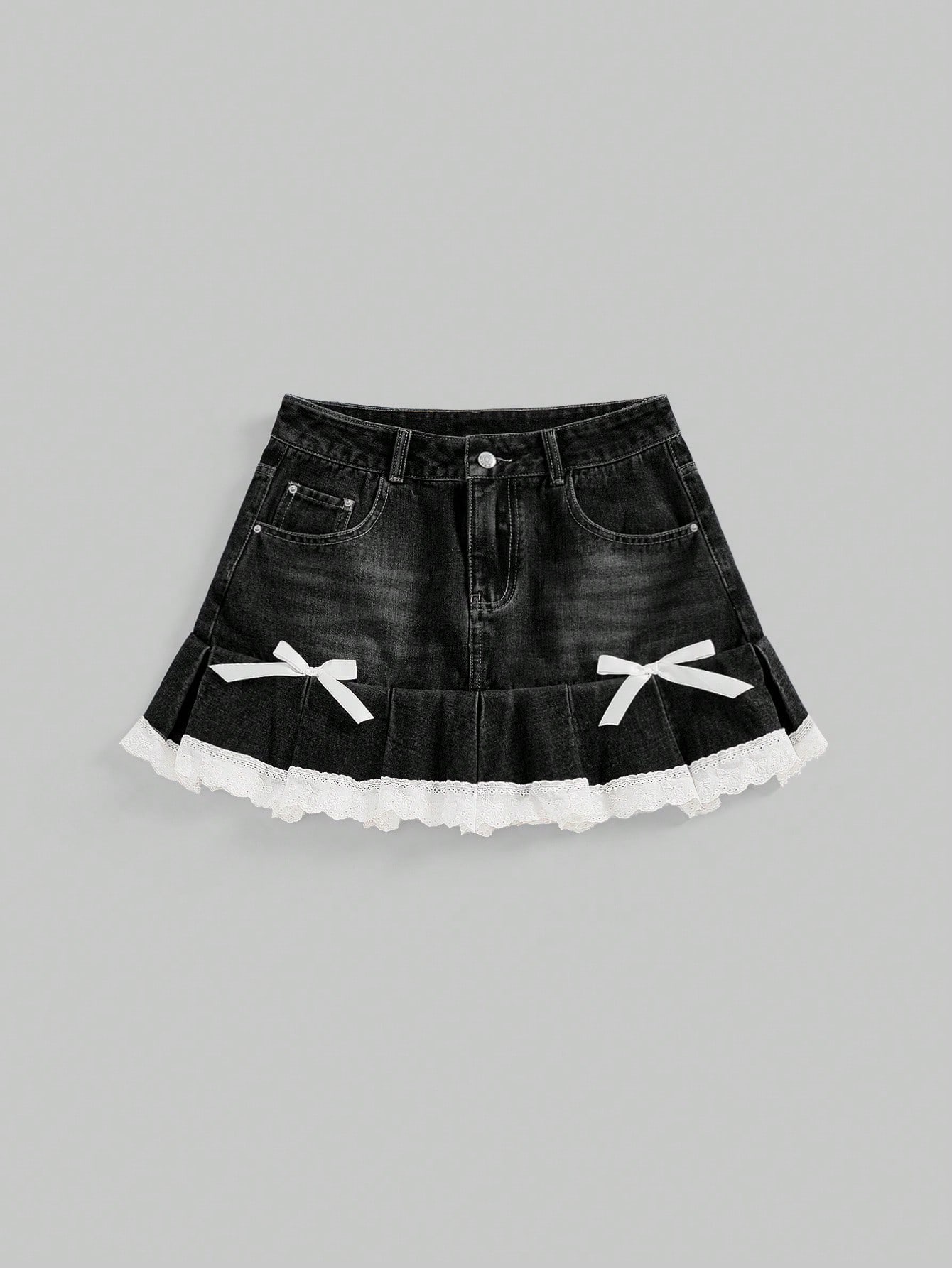 Kawaii Girl Style Denim Patchwork Ruffle & Bow Decor A-Line Skirt