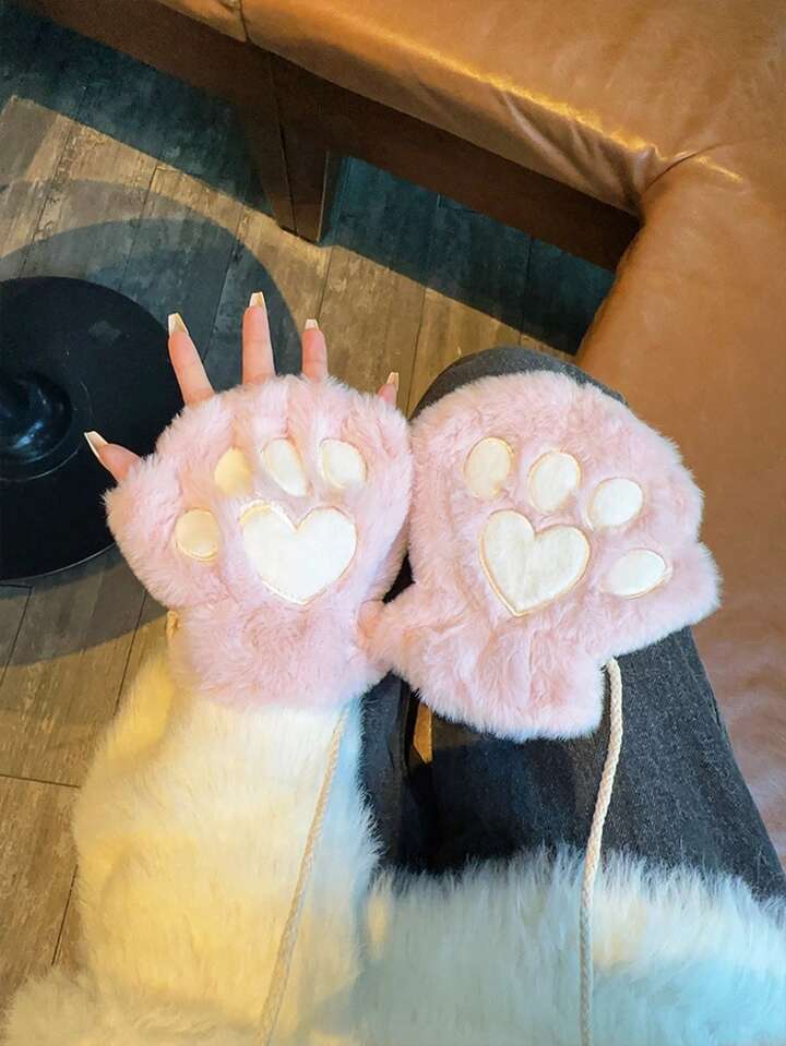 Kawaii Halloween Cute Cartoon Cat Paw Embroidery Fingerless Gloves, Warm Fluffy Half Finger Mittens For Outdoor, Autumn/Winter