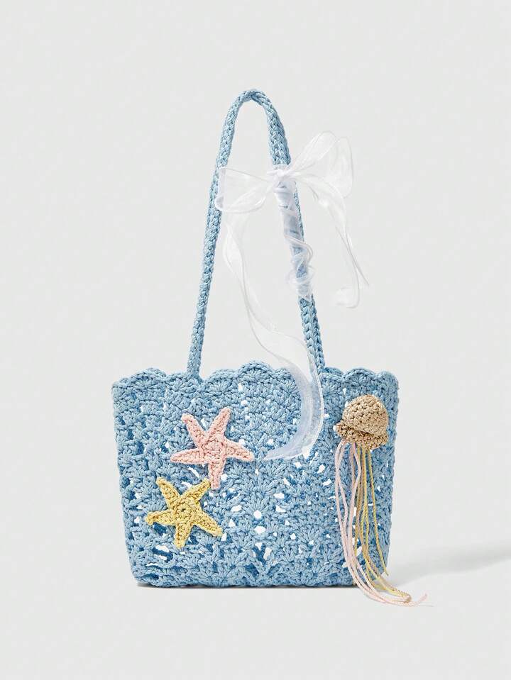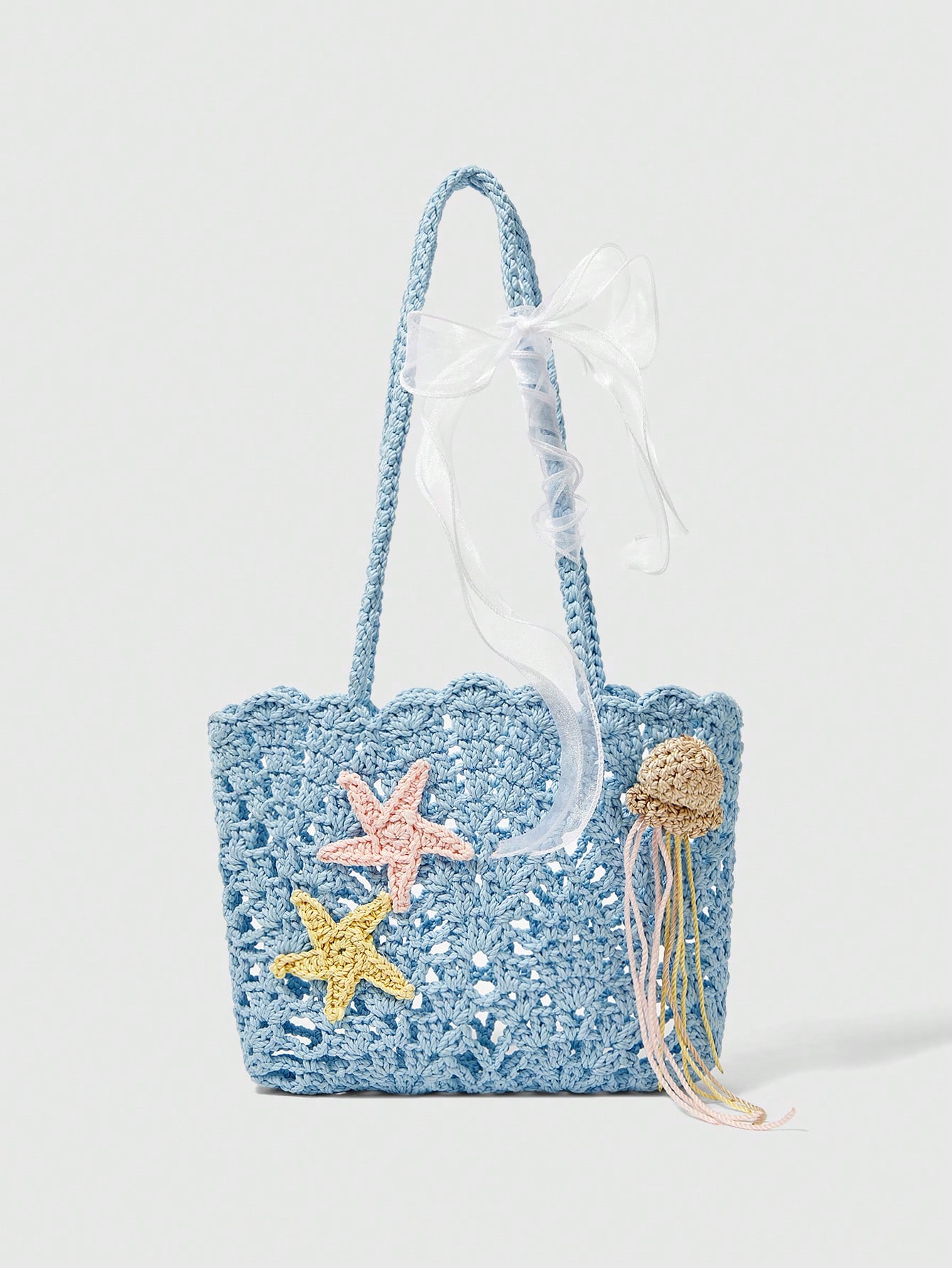 Kawaii Handmade Crochet Starfish Decor Shoulder Bag, Casual & Holiday