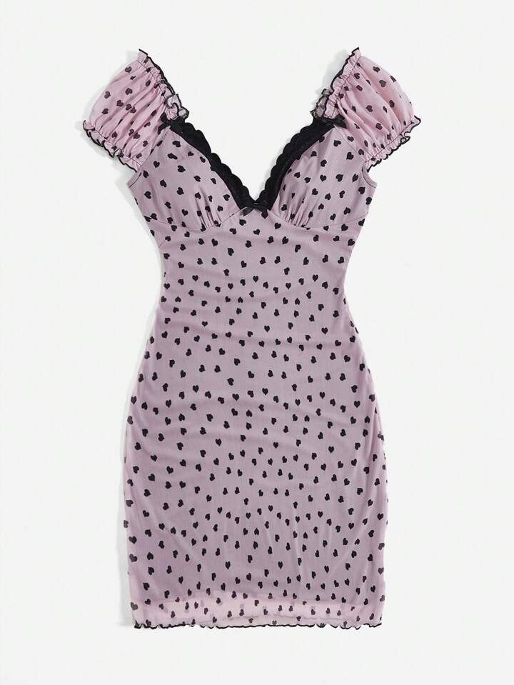 Kawaii Heart Print Contrast Lace Dress