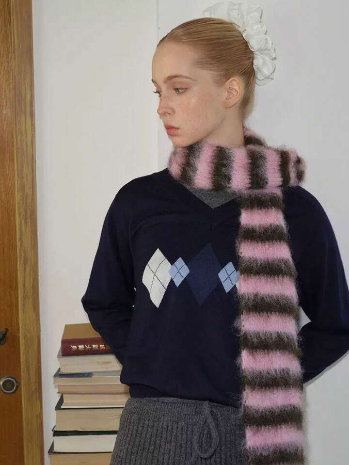Kawaii Korean Designer Contrast Stripe Knit Scarf, Warm Striped Cashmere Scarf, Niche Fine Soft Knitted Neck Warmer, Fashion Street Style Scarf For Women, Autumn/Winter For Dress