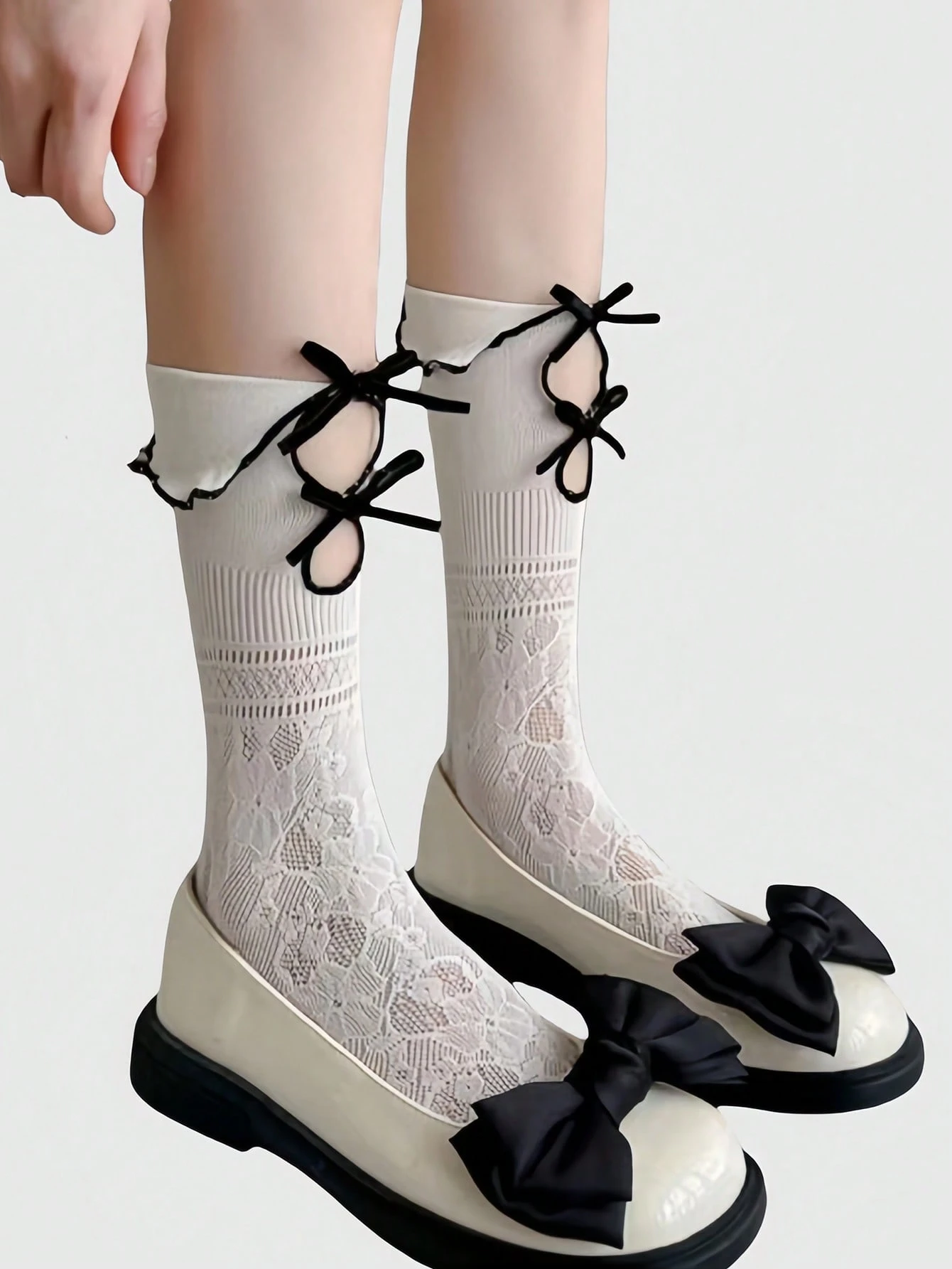 Kawaii Lolita Style Bow Mid-Calf Socks With Hollow Design For Girls