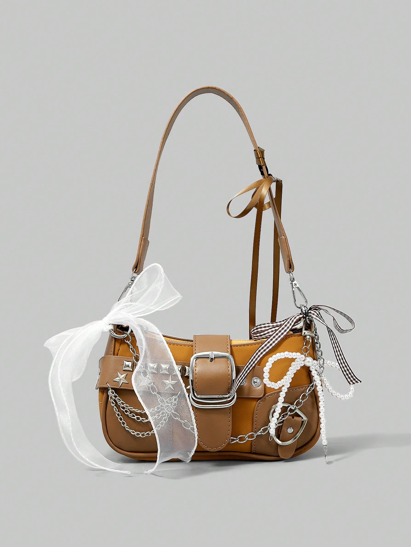 Kawaii New Stylish Women's Crossbody Bag With Chain Pendant, Punk Rock Motorcycle Girl Crossbody Bag, Cute Dark Aesthetic