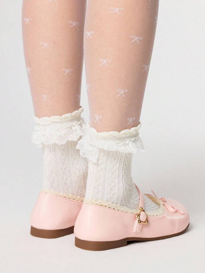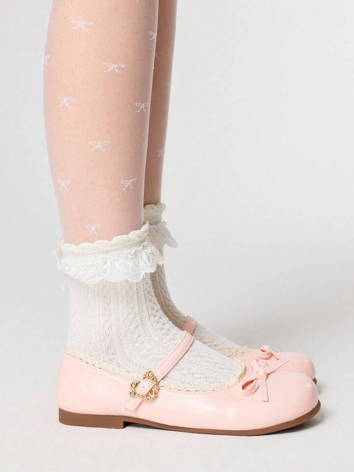 Kawaii Pink Mary Jane Shoes, Closed Toe Lolita Shoes With Bow & Lace, Ballet Flats For Women