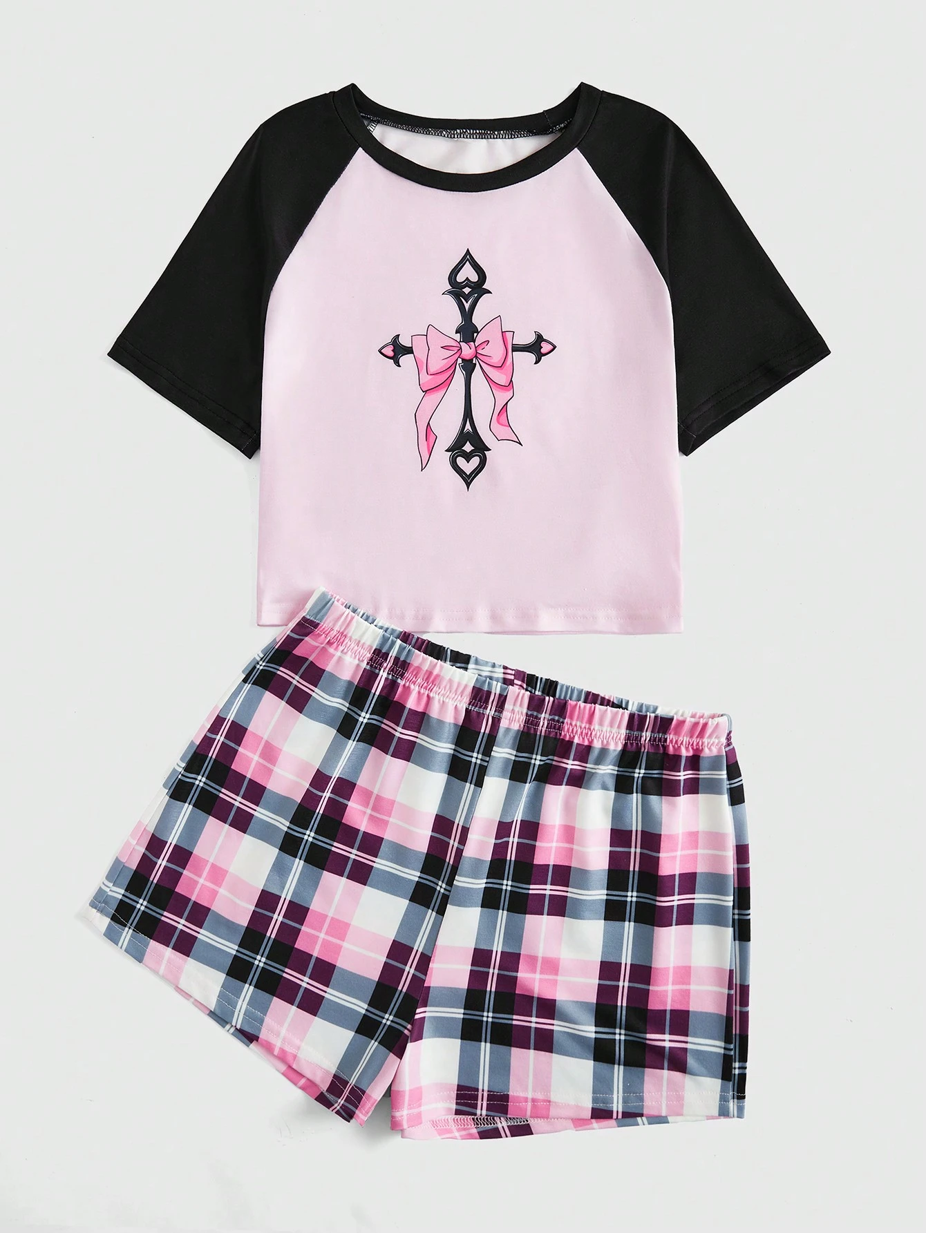 Kawaii Plaid & Bow Print Raglan Sleeve PJ Set