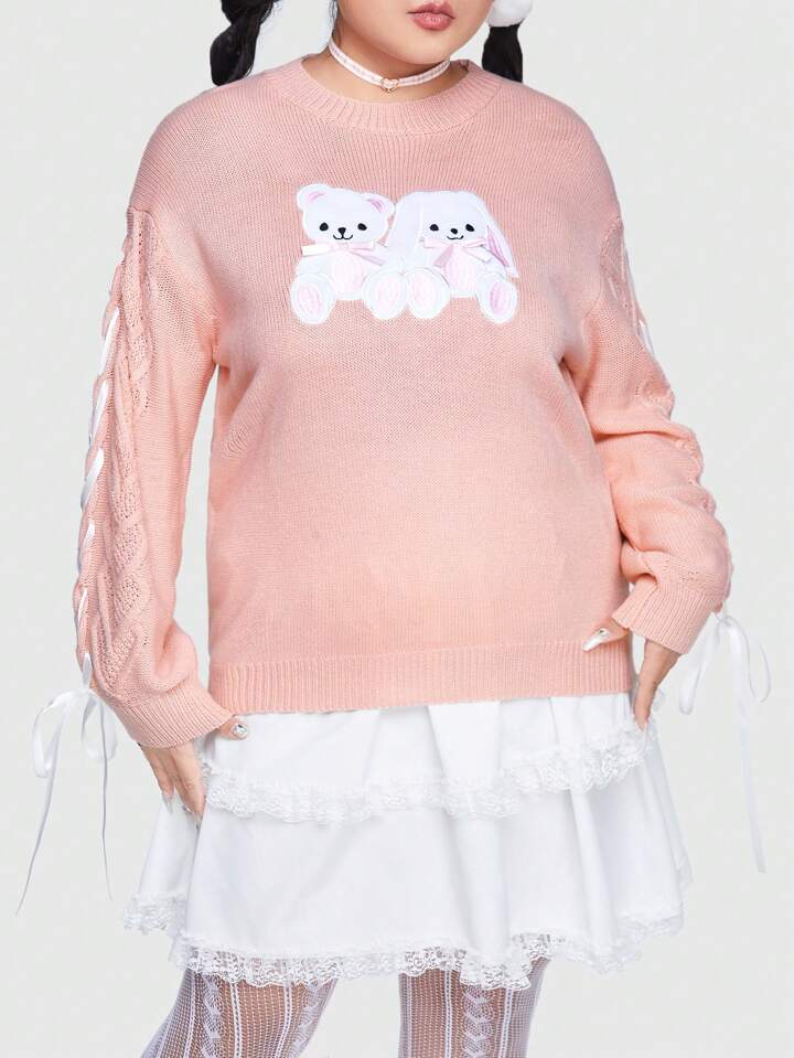 Kawaii Plus Cartoon Pattern Lace Up Sleeve Drop Shoulder Sweater