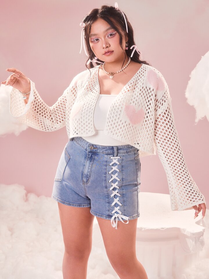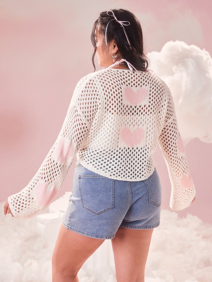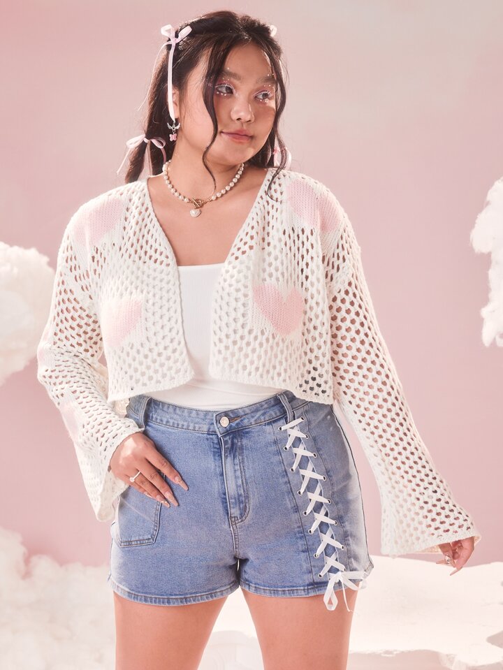 Kawaii Plus Heart Pattern Open Knit Drop Shoulder Cardigan
