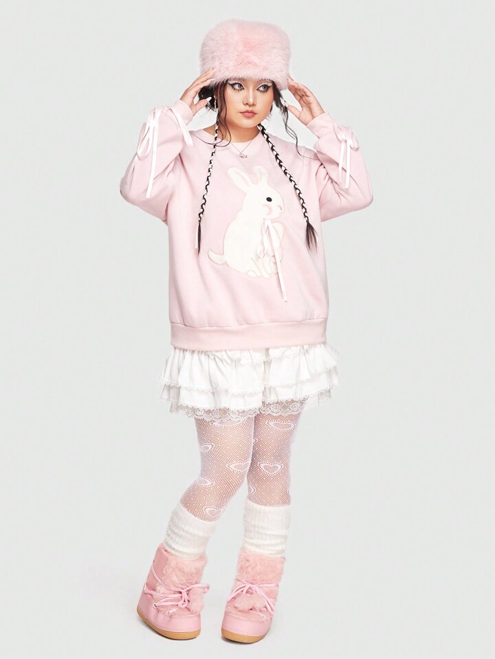 Kawaii Plus Rabbit Embroidery Drop Shoulder Sweatshirt