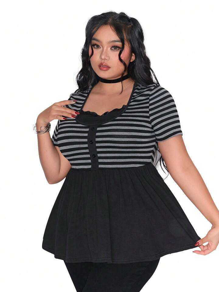 Kawaii Plus Size Casual 2 In 1 Lace Trim Bow Stripe Babydoll T-Shirt