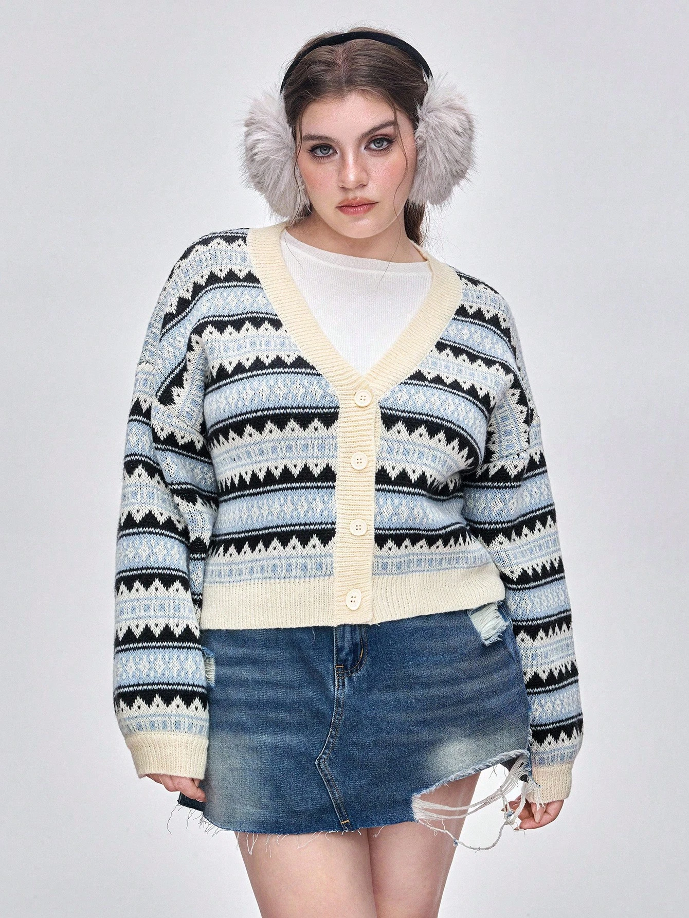 Kawaii Plus Size Casual Versatile Slimming Fair Isle Knit Cardigan, Autumn/Winter