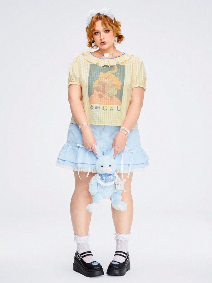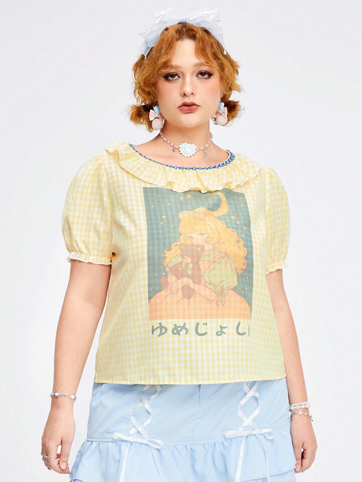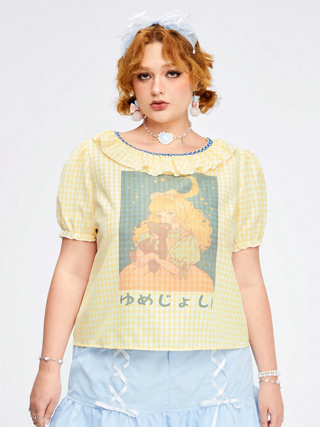 Kawaii Plus Size Cute Cartoon Print & Gingham Plaid Frill Trim Blouse