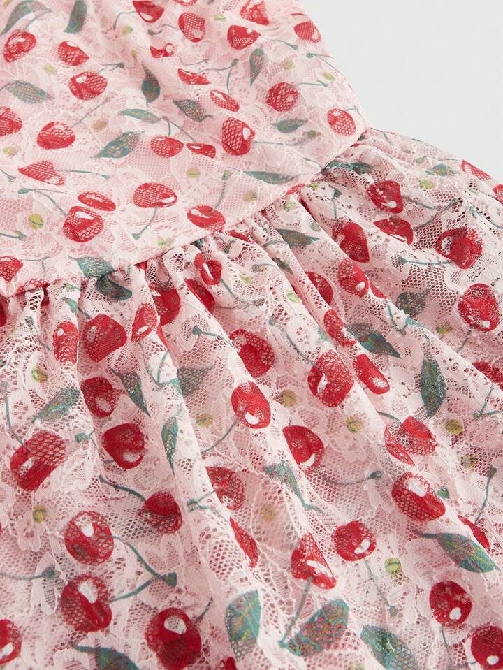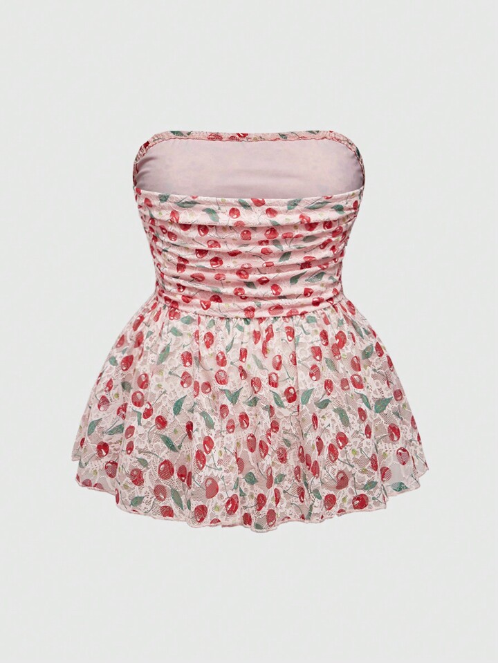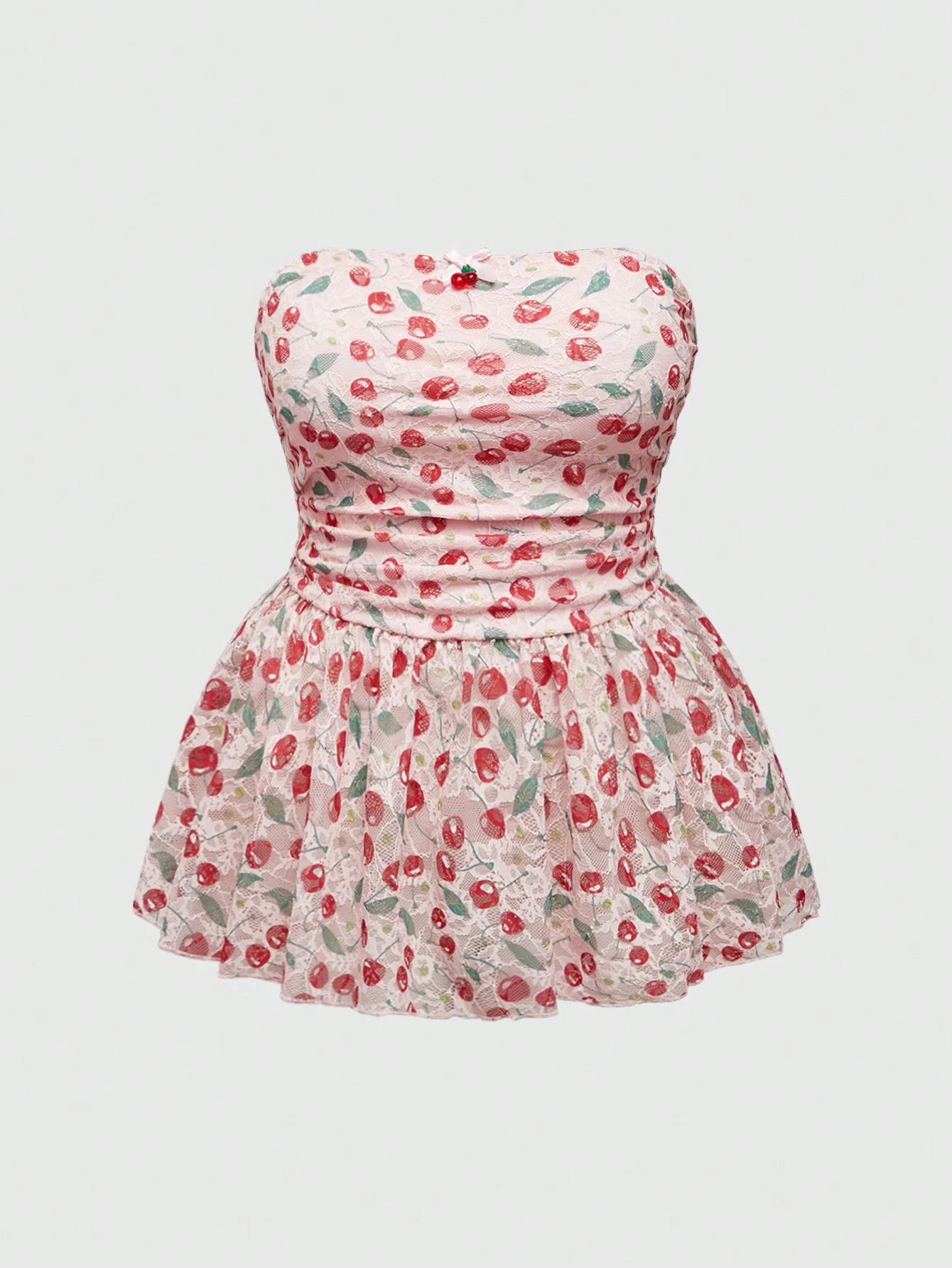 Kawaii Plus Size Cute Sexy Vacation Lace Cherry Allover Print Bowknot Ruched Stretch Babydoll Tube Top