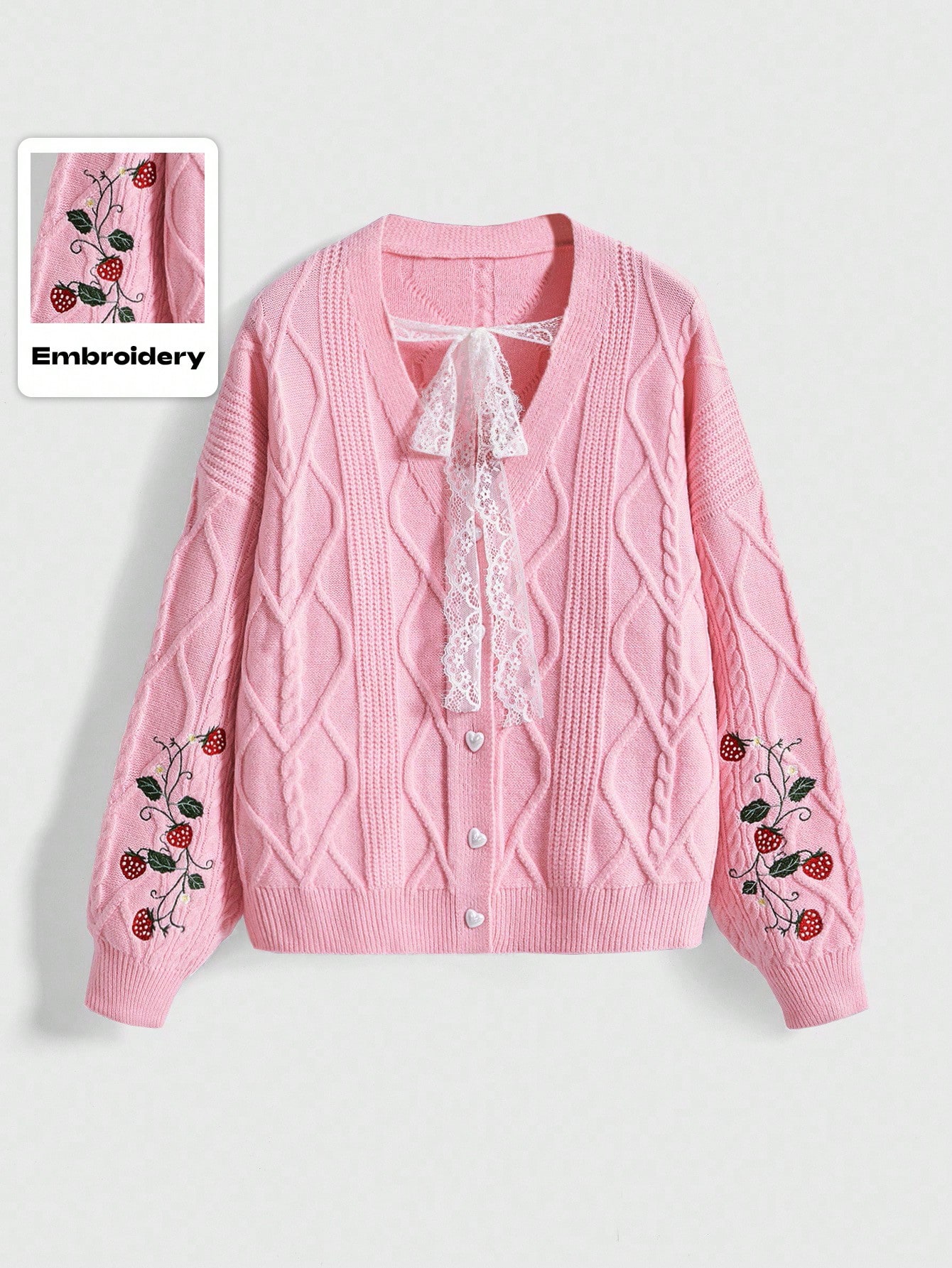 Plus Size Kawaii Elegant Strawberry Vine Pattern Lace Tie Neck Cardigan Sweater, Autumn/Winter Plus Size Women Long Sleeve Knit Top, Casual Commute School Style, Sweet Pink Sweater Cardigan