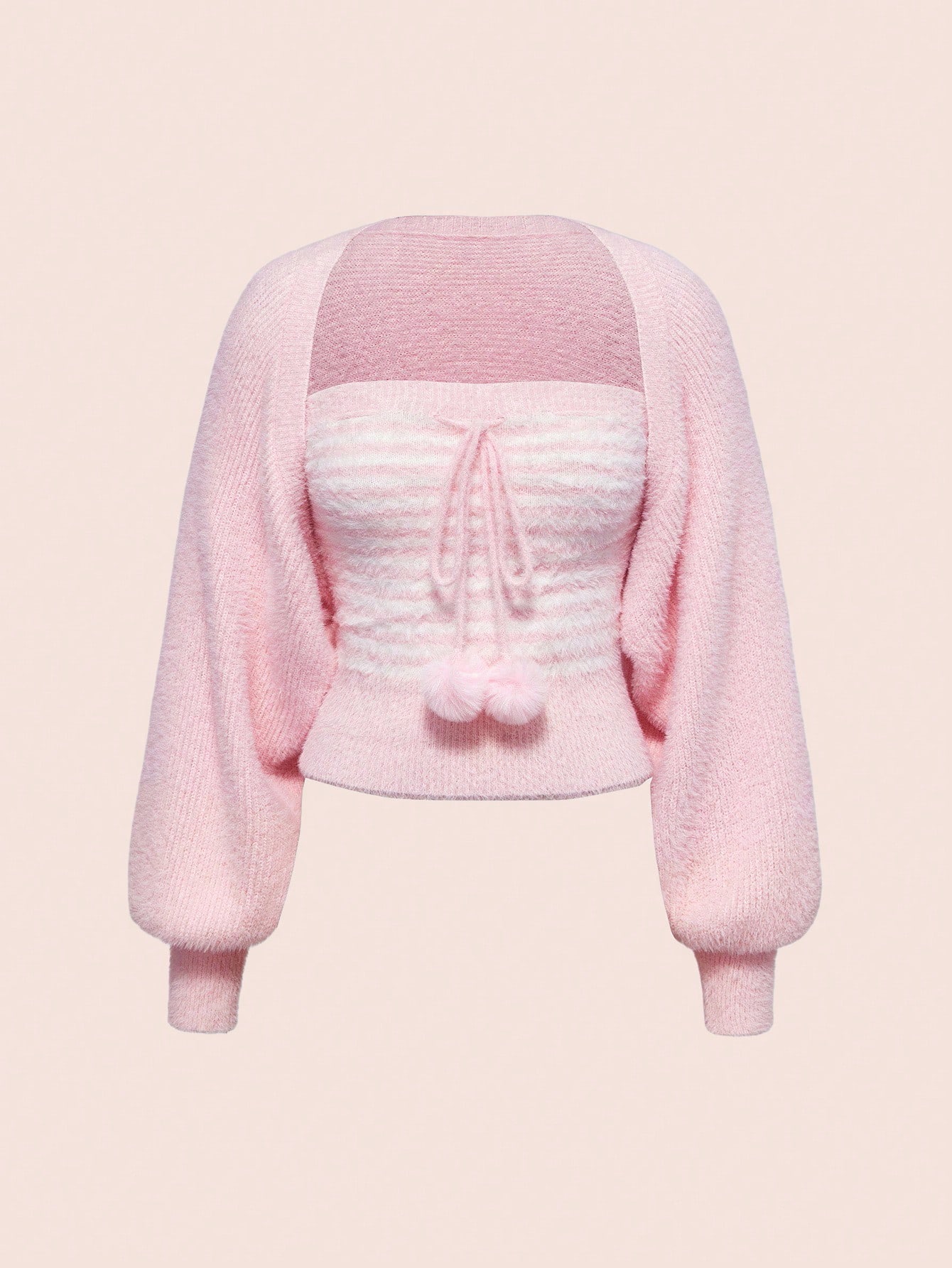 Kawaii Plus Size Soft & Cozy Pink Striped Cute Tube Top & Long Sleeve Cardigan Set