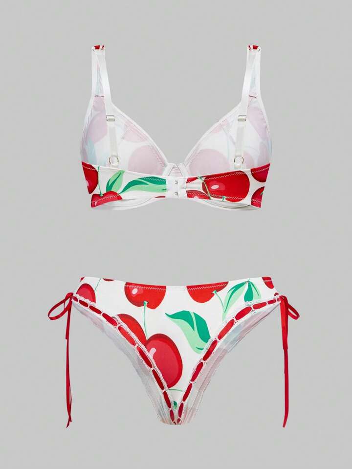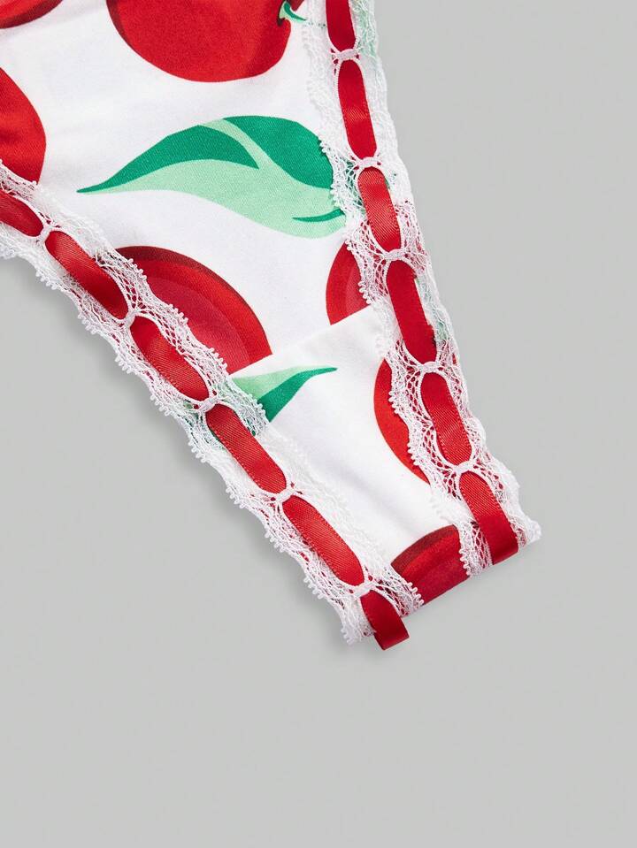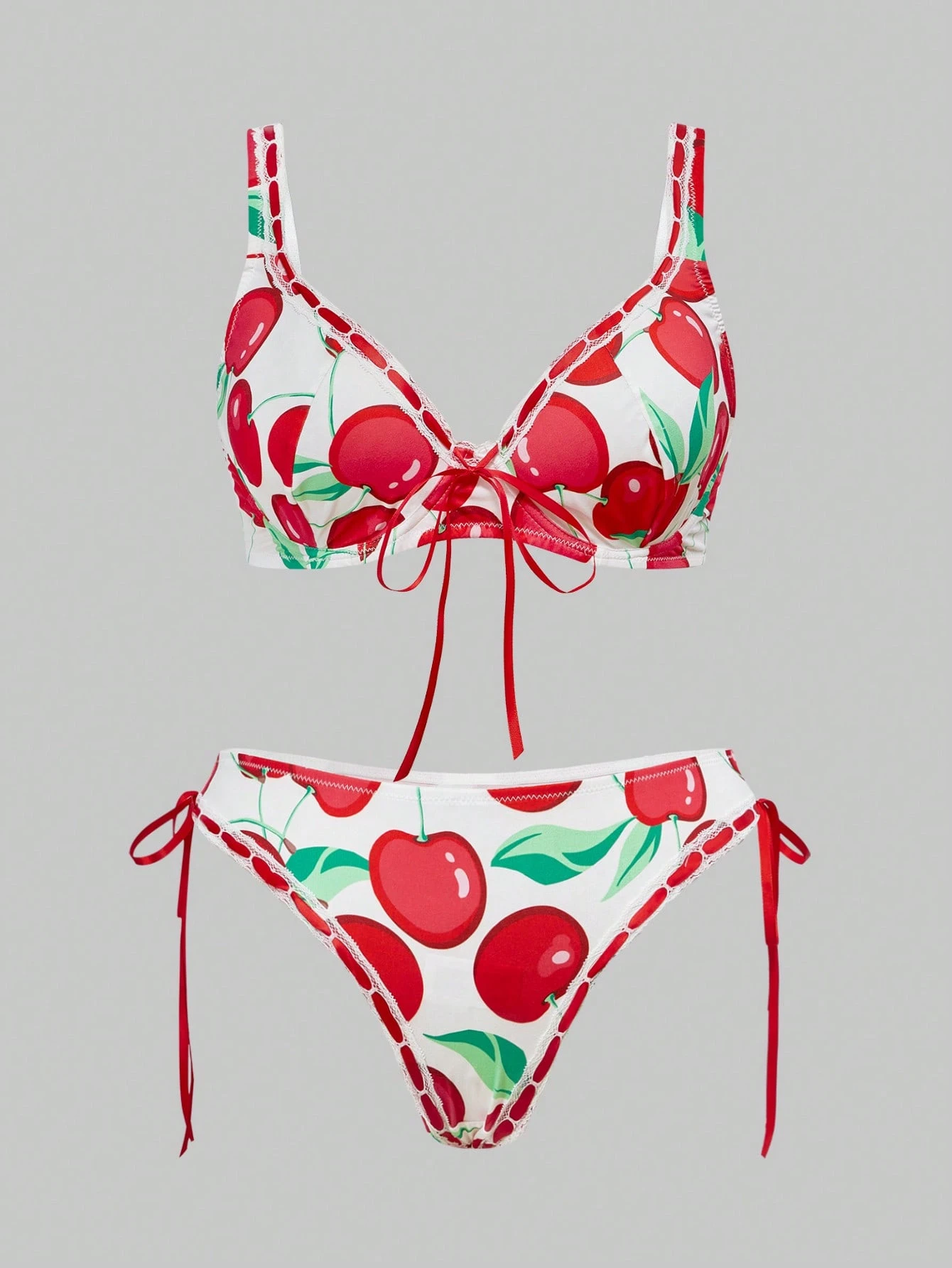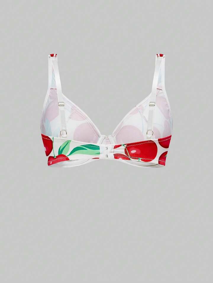 Kawaii Plus Size Sweet Cherry Print Satin Ribbon Bow Handsewn Underwire Lingerie Bra Set, Pastoral Style