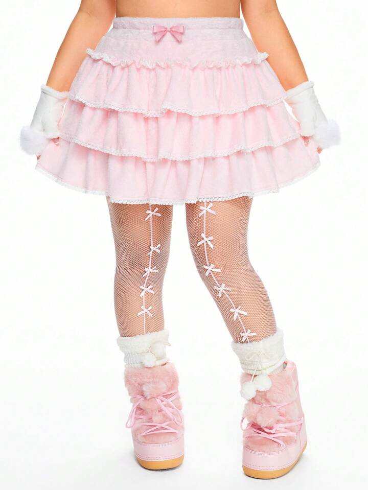 Kawaii Plus Size Women Cute Lace Bow Layered Ruffles Fluffy Skirt, Autumn/Winter