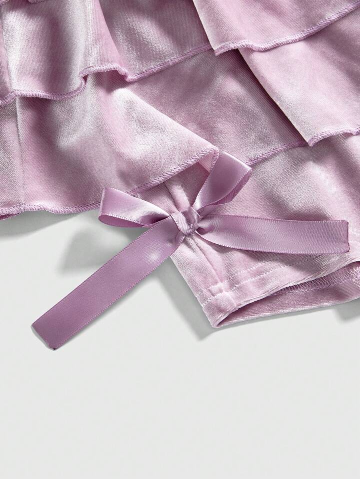 Kawaii Plus Size Women Dark Velvet Ruffle Hem Front Tie Bow Shorts With Anti-Exposure Design