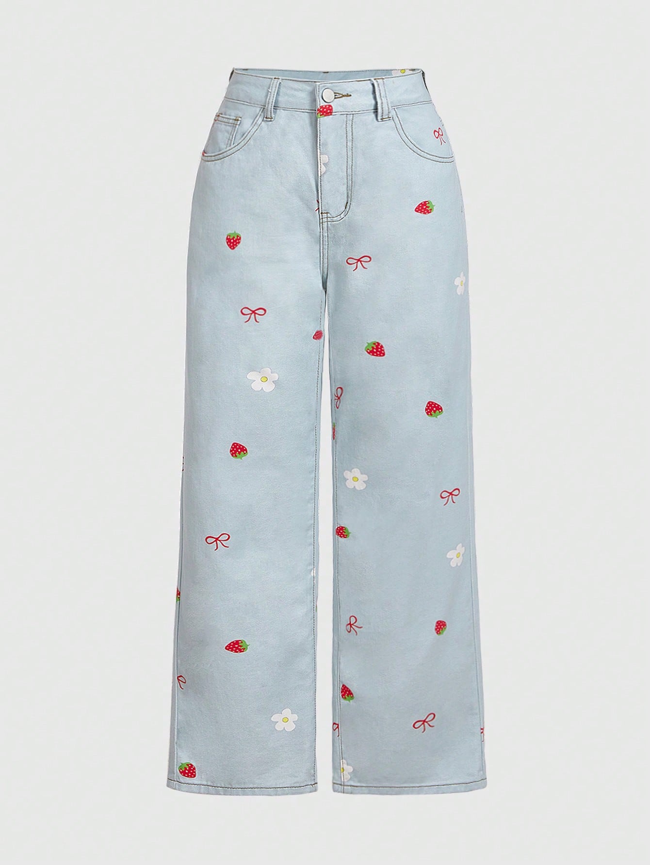 Kawaii Plus Size Women Strawberry Bow Flower Denim Jeans