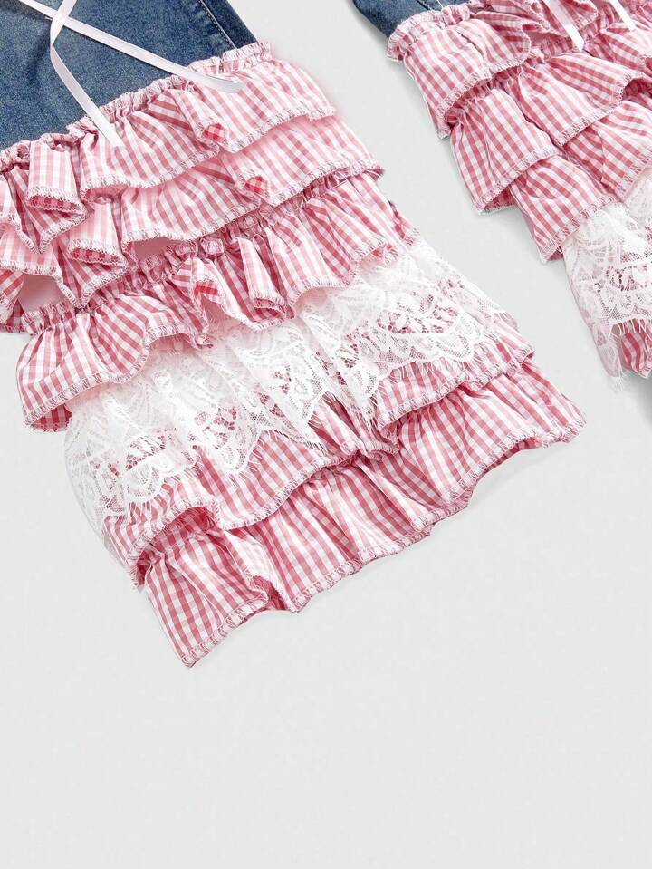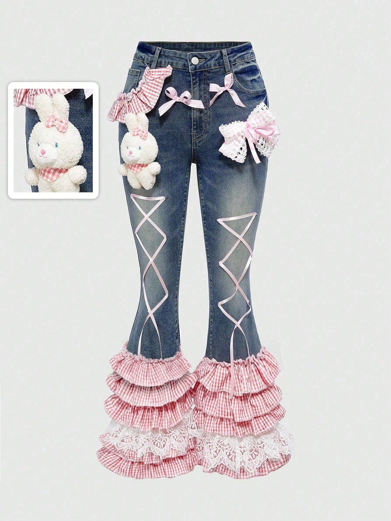 Kawaii Plus Size Women Y2K Teen Plaid Lace Rabbit Pendant Bow Bell Bottom Flare Pants