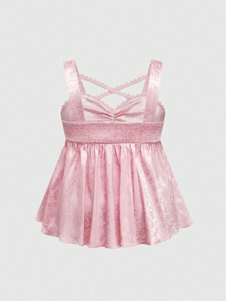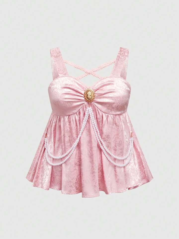 Kawaii Plus Size Women's Vintage Romantic Palace Jacquard Pearl Chain Lace Trim Floral Camisole