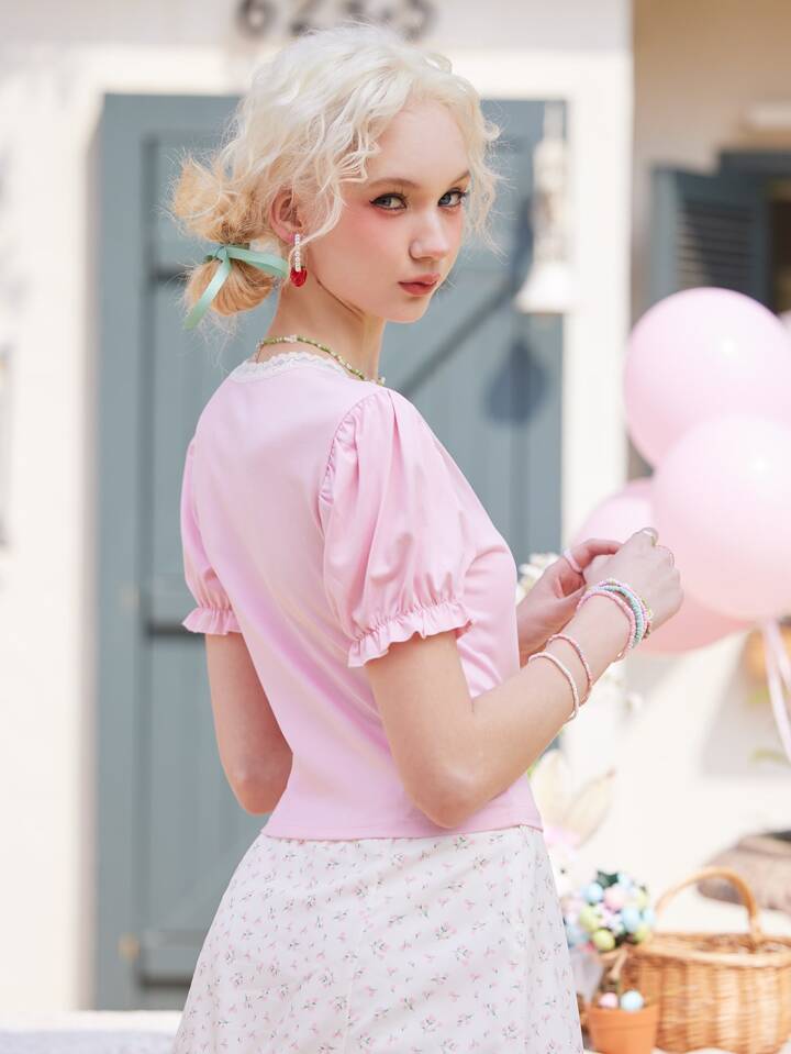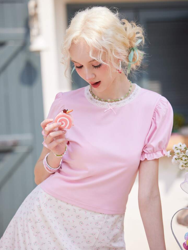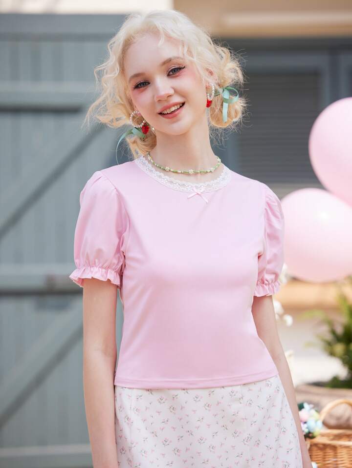 Kawaii Solid Puff Sleeve Contrast Lace Tee