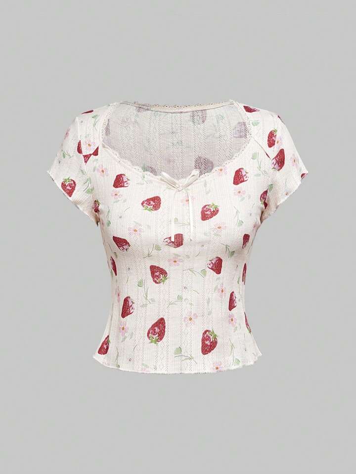 Kawaii Spring Casual Mori Girl Ditsy Floral Elastic Tight Tie Bow Detail T-Shirt For Women
