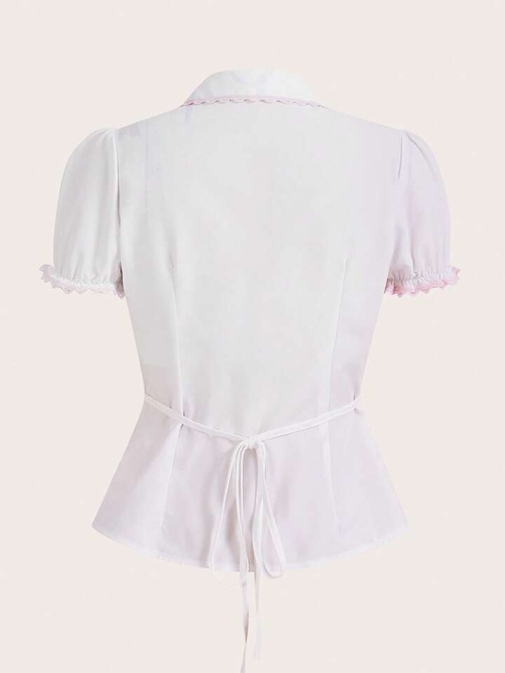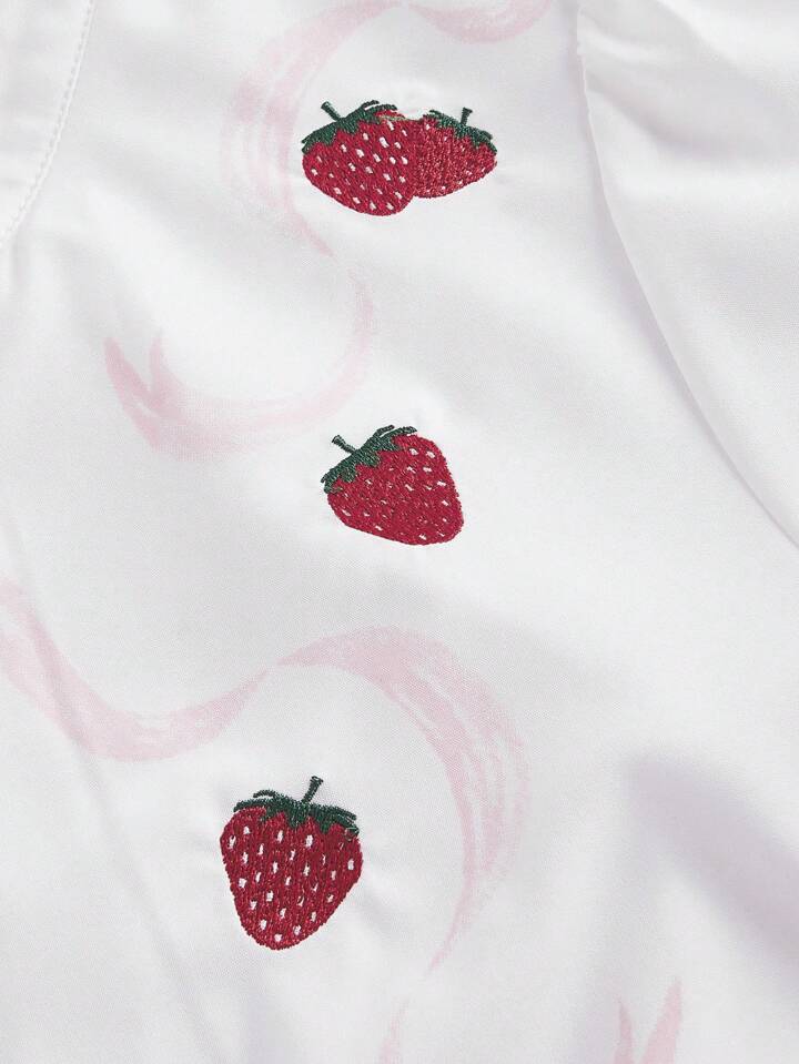 Kawaii Strawberry Embroidery Bow Front Puff Sleeve Shirt