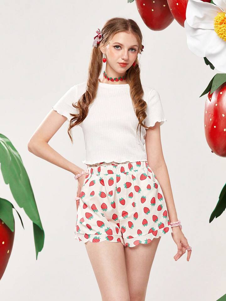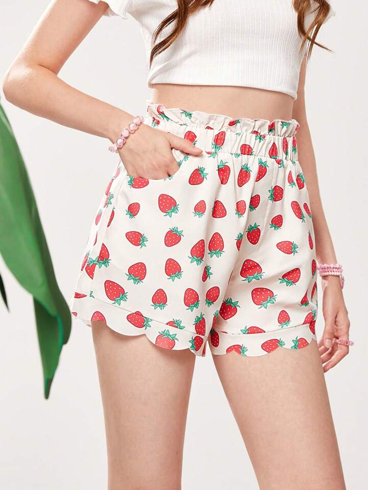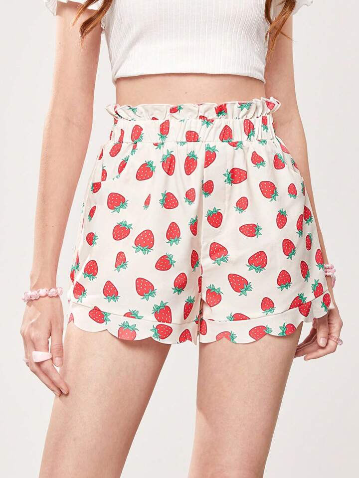 Kawaii Strawberry Print Paperbag Waist Shorts