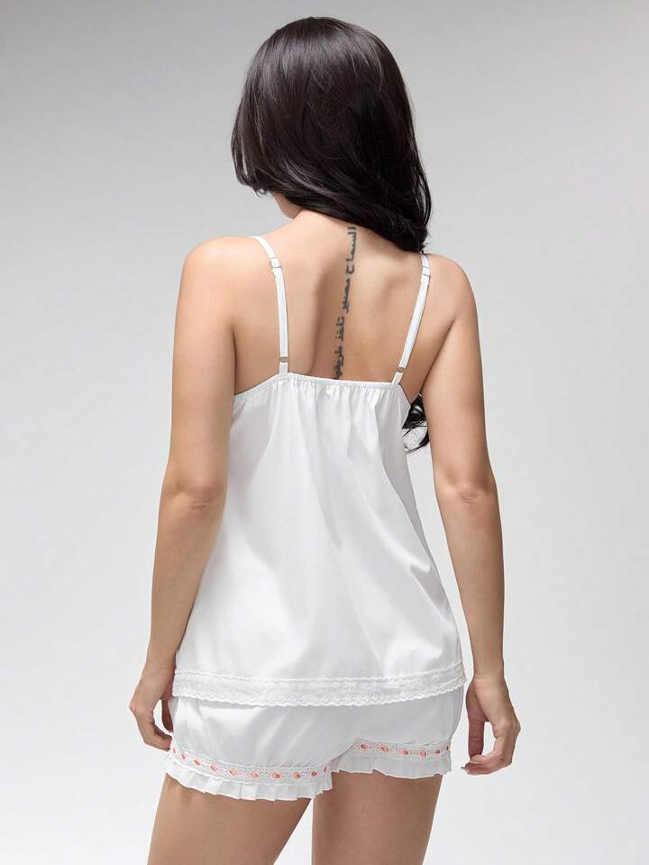 Kawaii Summer Cute Cami Top With Ribbon & Lace, Elastic Waist Satin Shorts, Casual Sleepwear Set