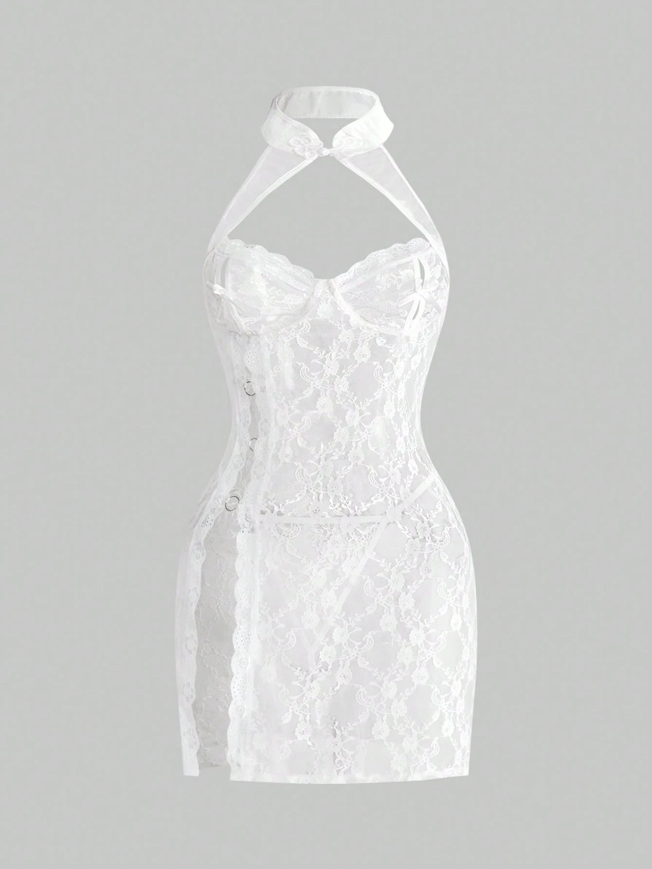 Kawaii Sweet & Sexy New Chinese Style Spaghetti Strap Backless High Slit Dress With Thong Lingerie Set