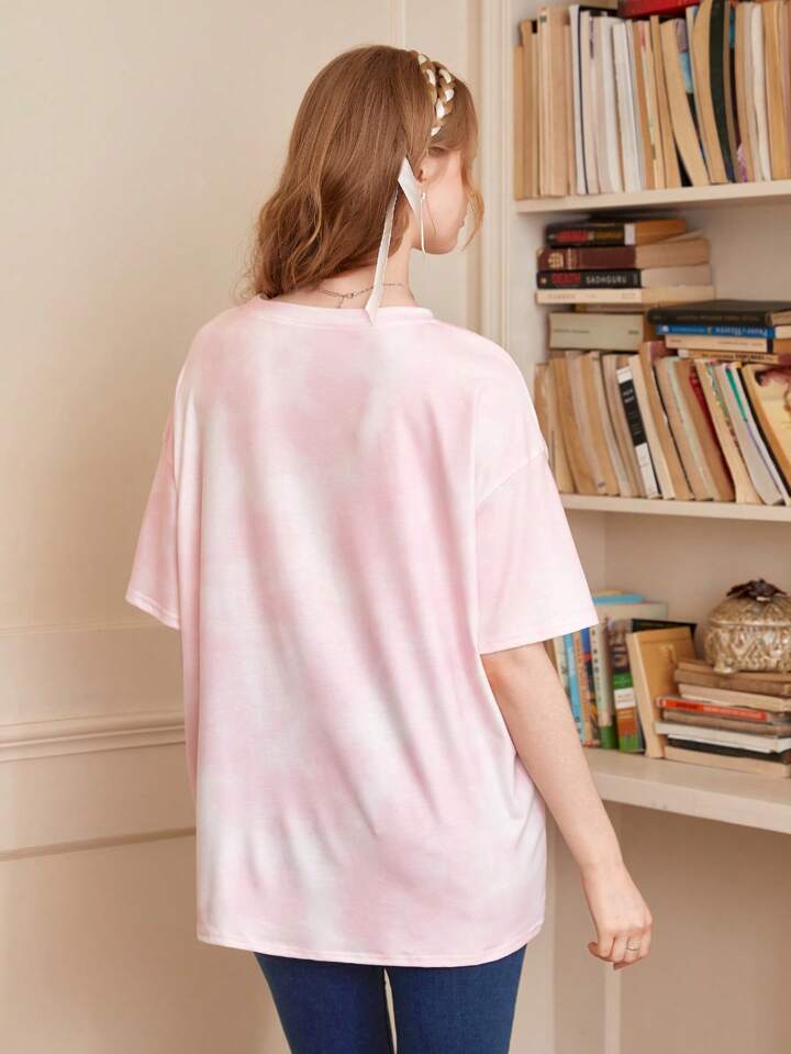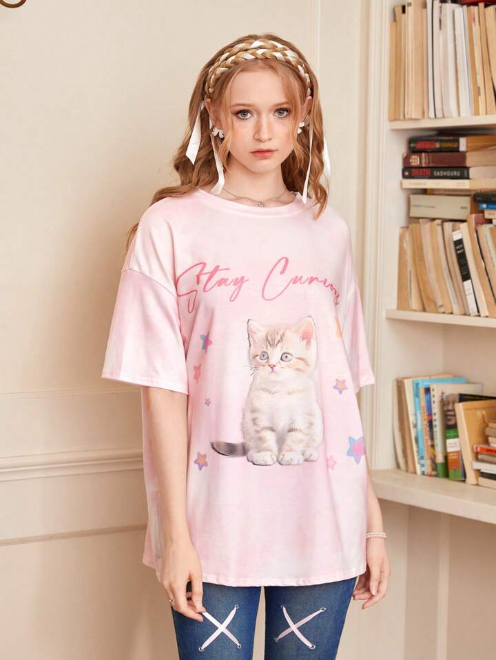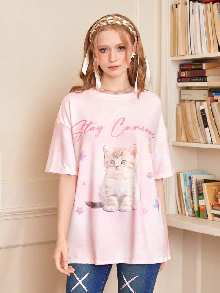 Kawaii Tie Dye Cat & Slogan Graphic Drop Shoulder Tee