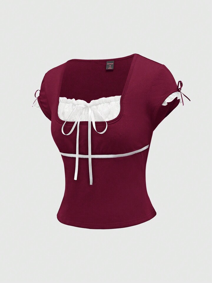 Kawaii Valentine's Day Burgundy Sweetheart Neck Lace Patchwork Ballet Style Colorblock Puff Sleeve Women T-Shirt Top