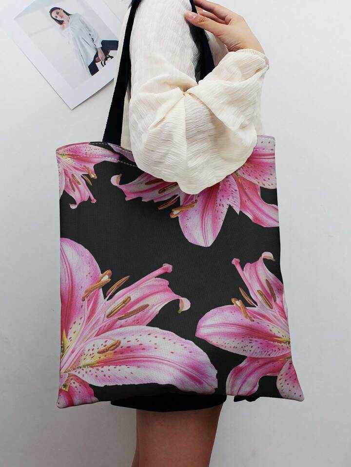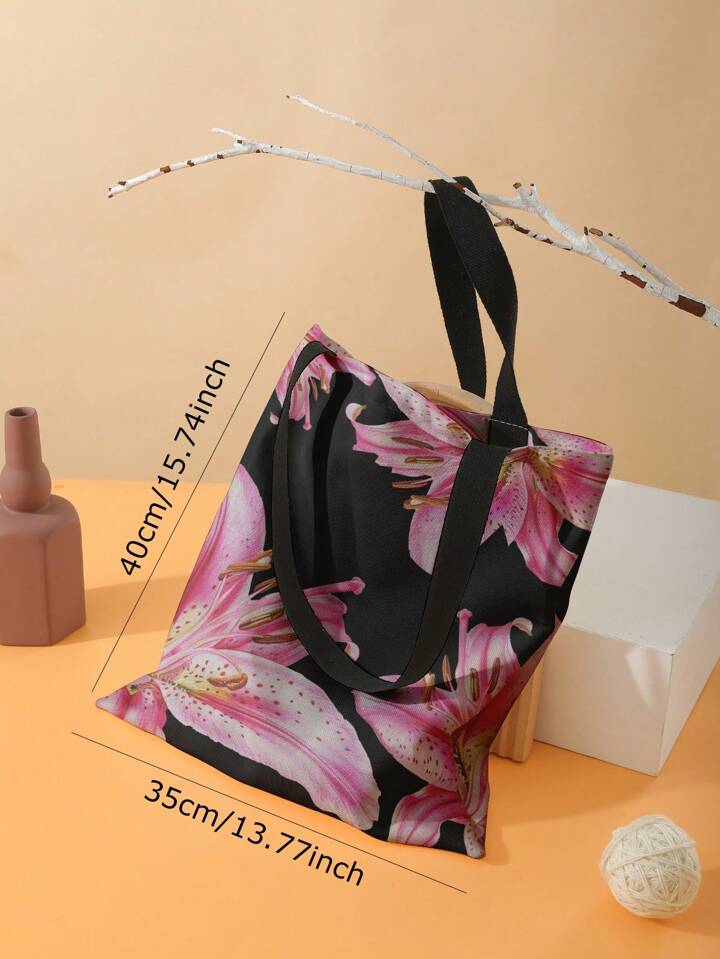 Kawaii Versatile Pink Flower Pattern Double-Sided Print Canvas Tote Bag, Suitable For Vacation, Commute And Holiday