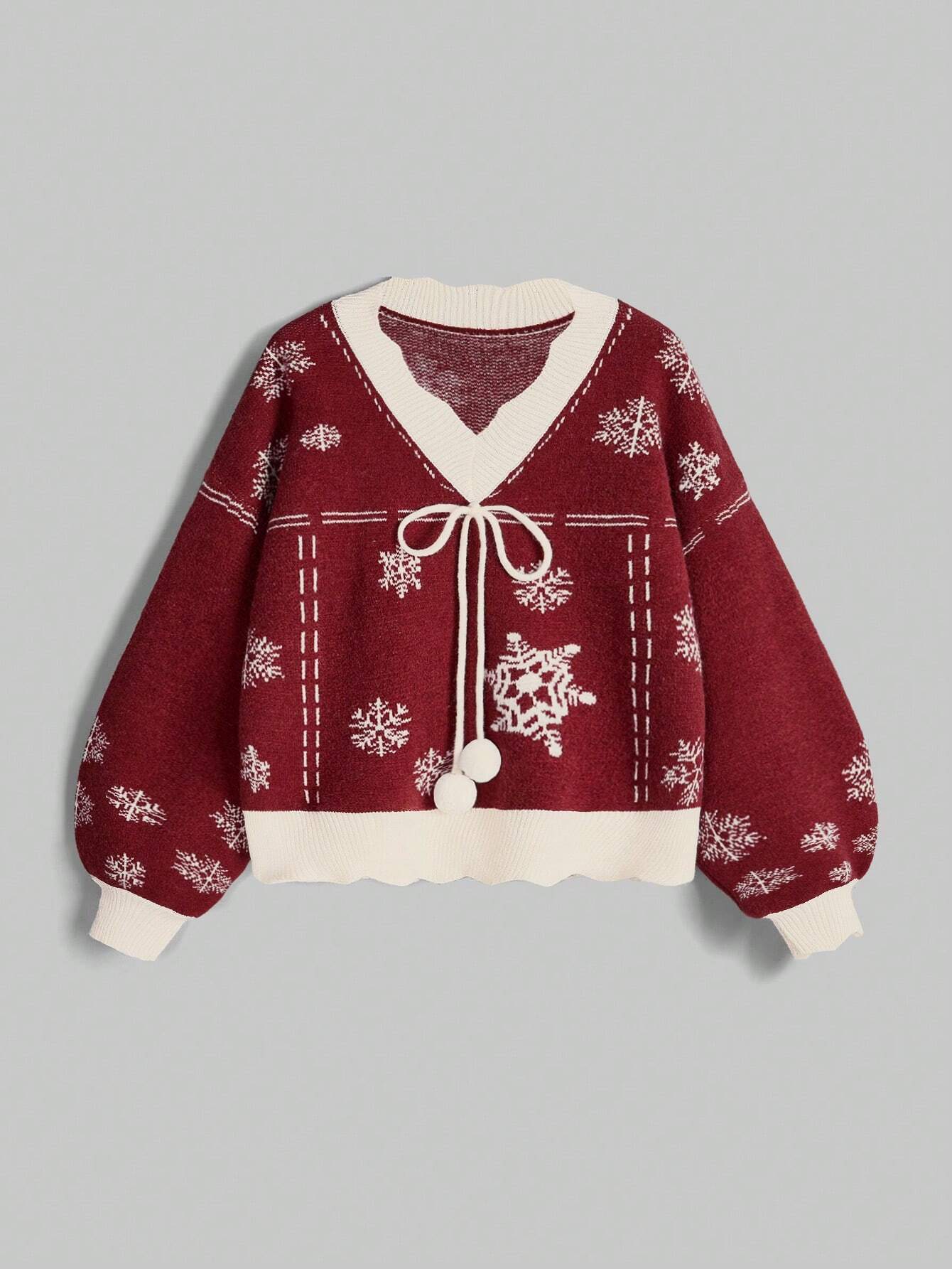Kawaii Vintage Snowflake Jacquard V-Neck Fuzzy Pullover Sweater For Women, Christmas, Autumn/Winter