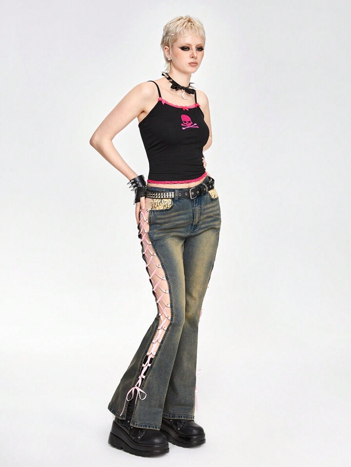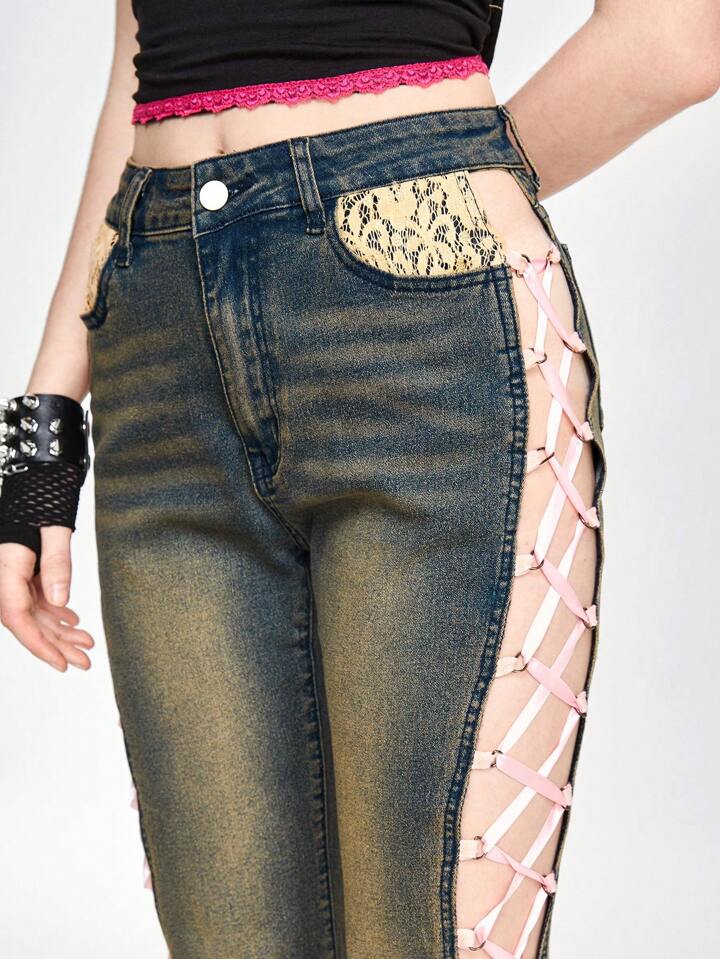 Kawaii Vintage Y2K Millennium Style Slim Fit Women's Denim Flared Pants With Side Seam Bow Tie