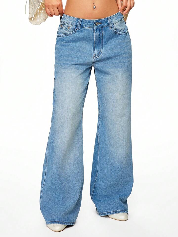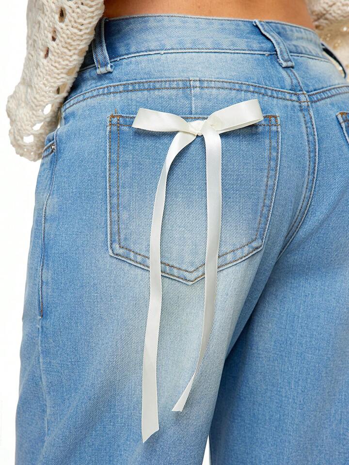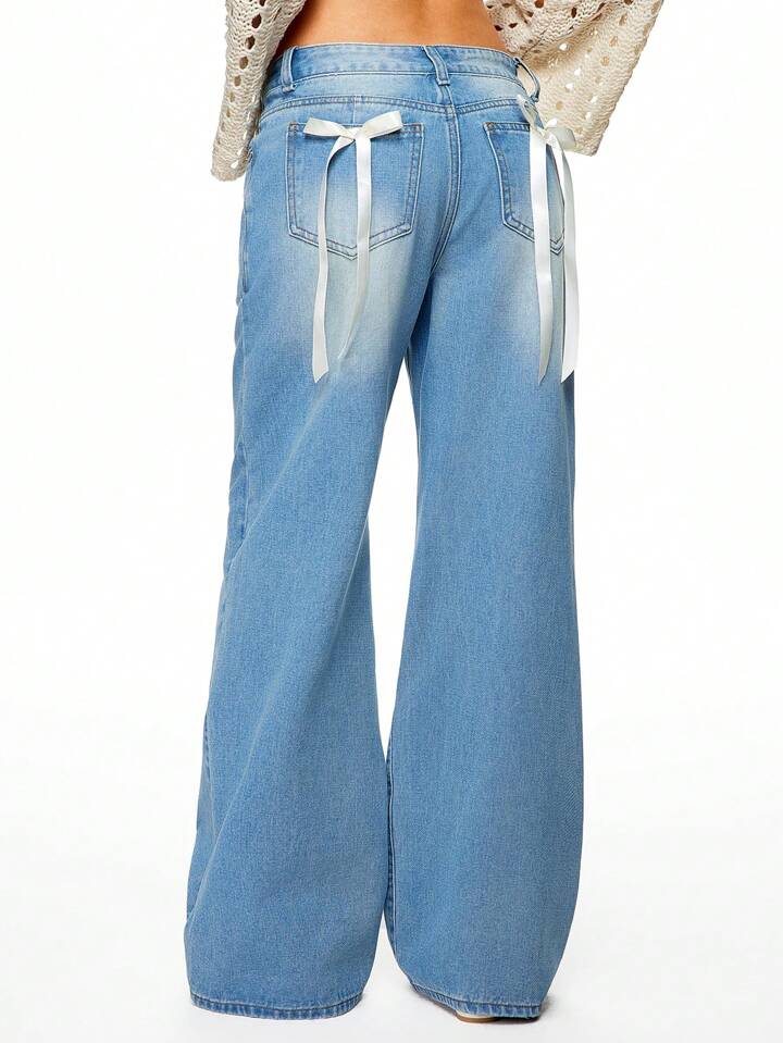 Kawaii Women Casual Bowknot Decor Washed Wide Leg Jeans