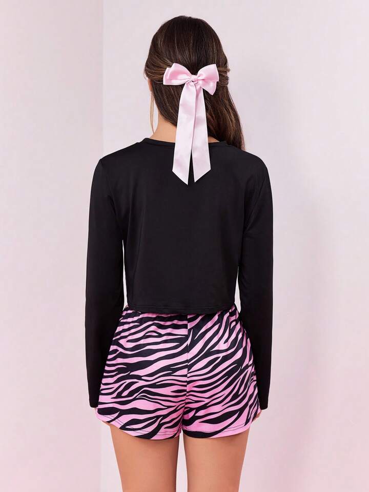 Kawaii Women Casual Charging Pattern Print Long Sleeve Shorts Pajama Set, Zebra Animal Print Colorblock Design