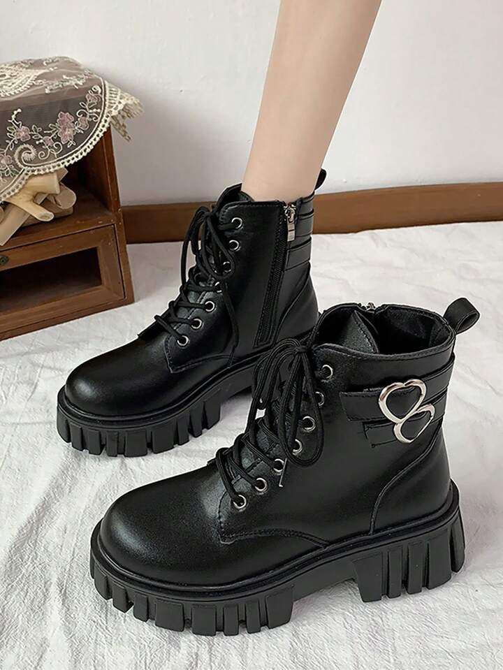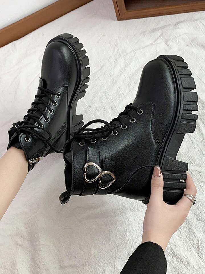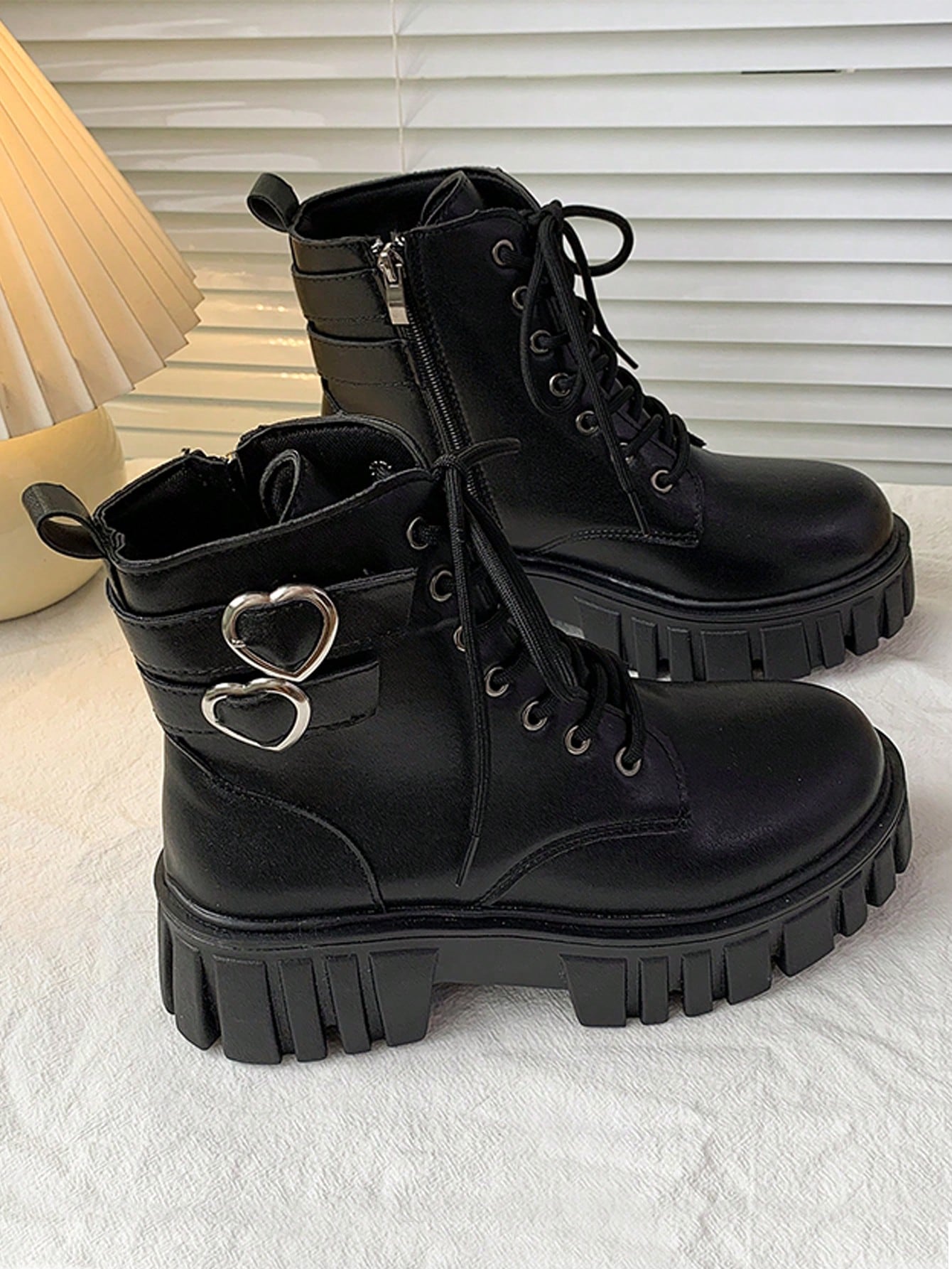 Kawaii Women Heart Buckle Decor Lace-up Front Combat Boots, Cool Outdoor Fashion Boots