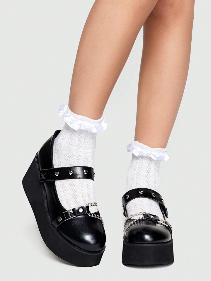 Kawaii Women Platform & Thick Sole Pumps Punk Style Round Toe Flatform Studded Belt Buckle High Heels