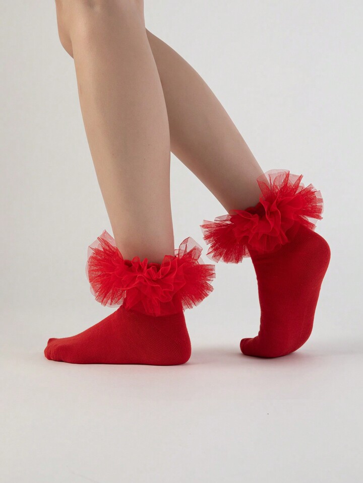 Kawaii Women Solid Color Calf-Length Ruffle Trim Socks For Daily Wear