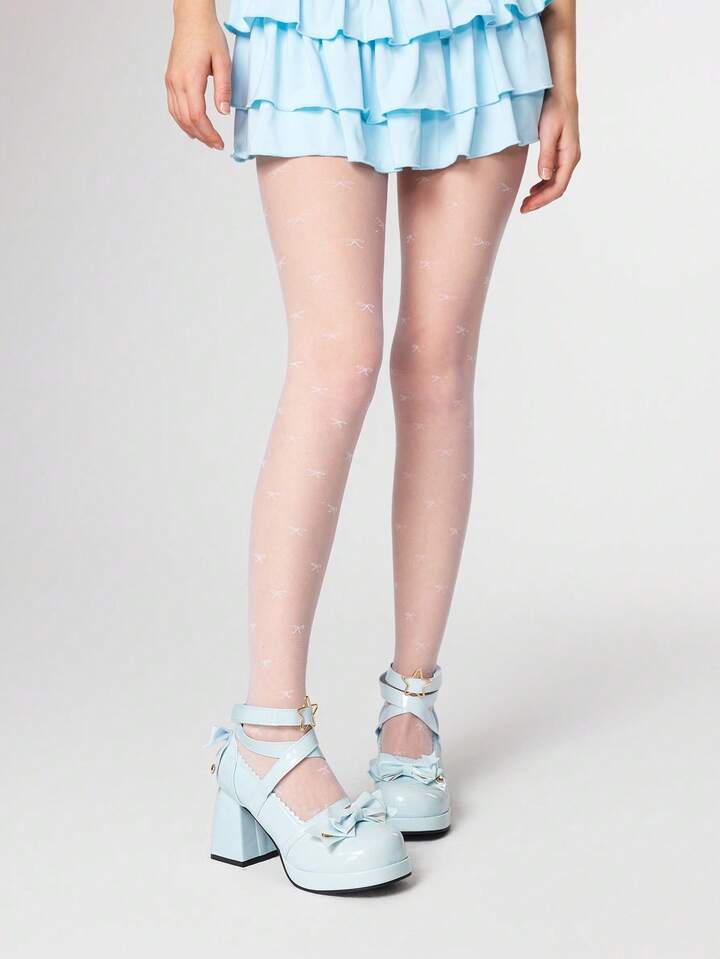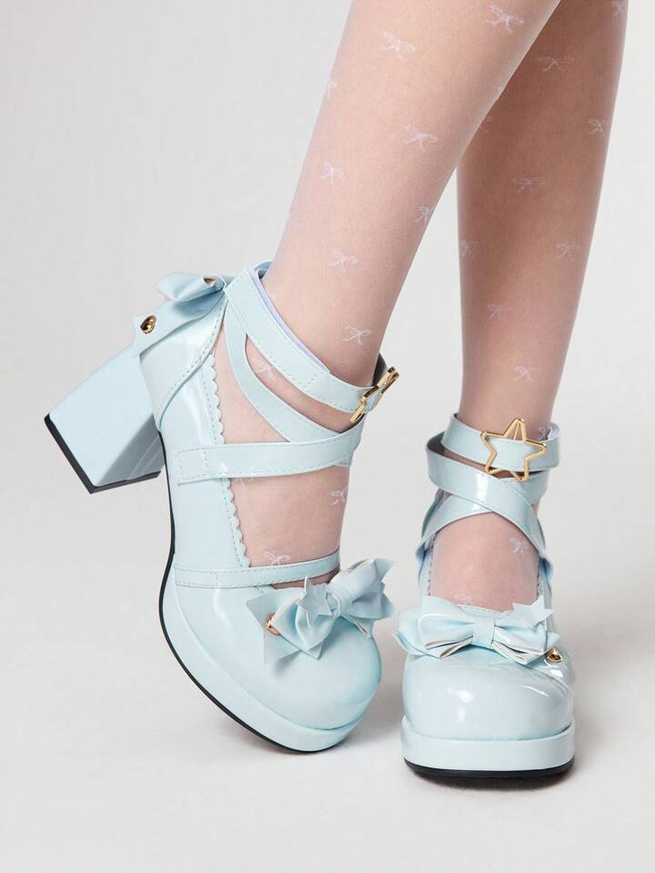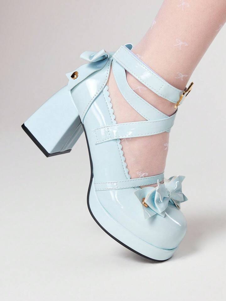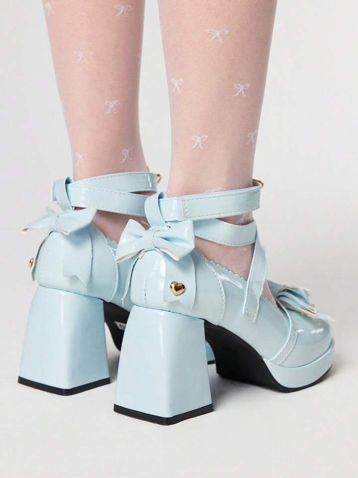 Kawaii Women's Blue High Heels Y2K Sweet Bow Punk Rock Goth Shoes Ankle Strap Lolita Mary Jane JK Uniform Shoes Lady Pumps