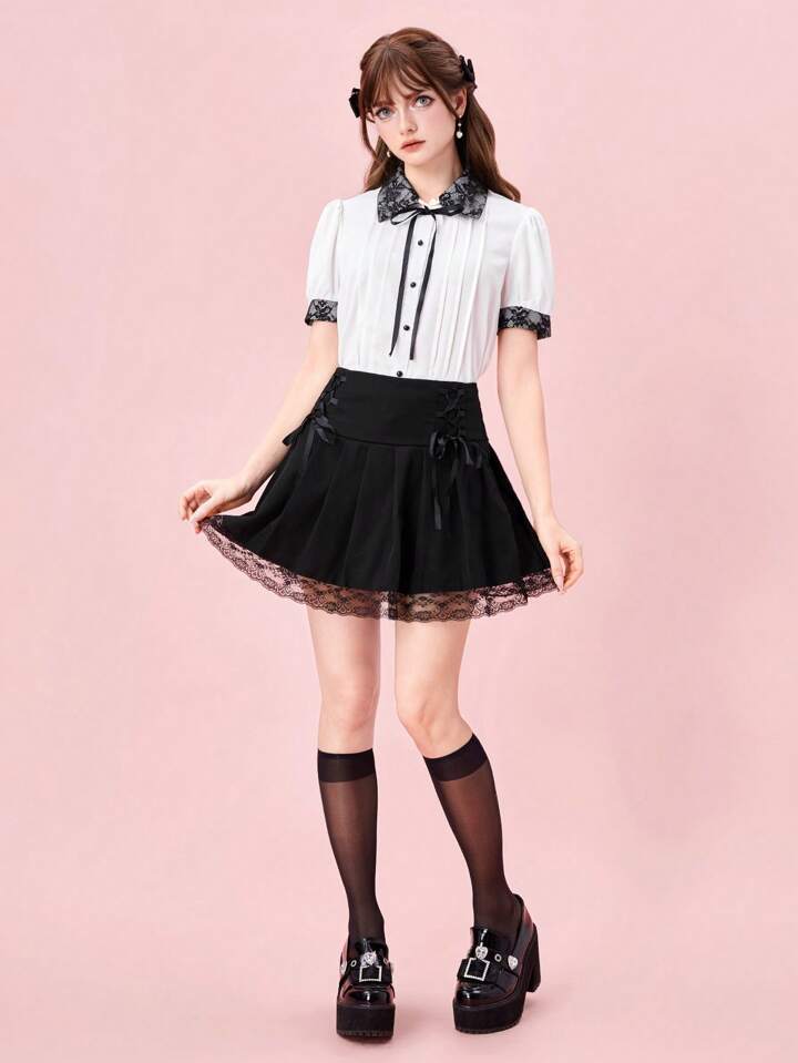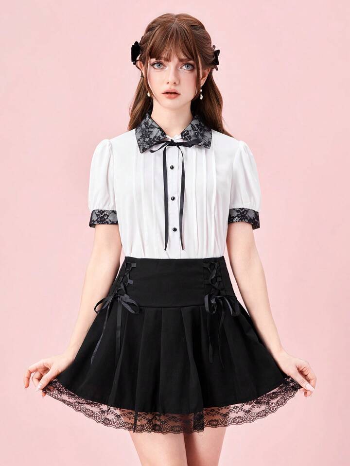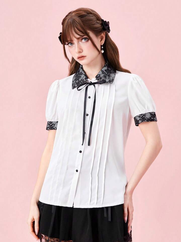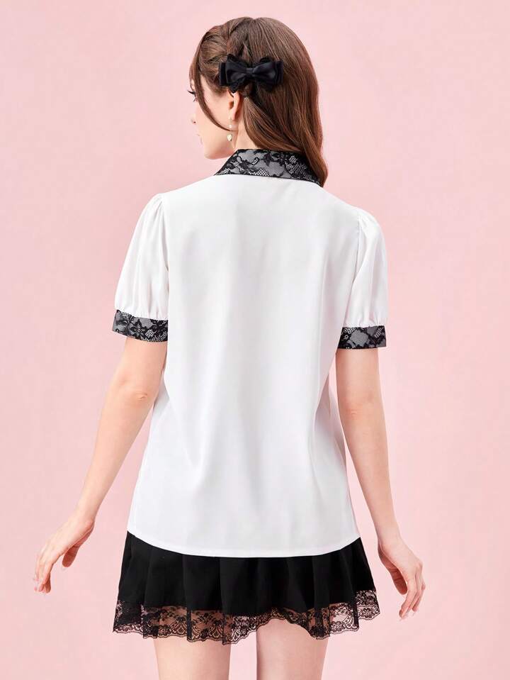 Kawaii Women's Bow Tie Short Sleeve Contrast Lace Shirt, Cute & Sweet College Style, School