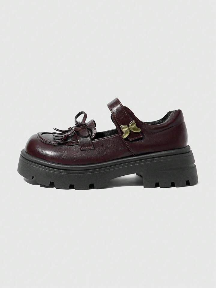 Kawaii Women's Brown Mary Janes Shoes With Buckle Strap, Bow Decor, JK Uniform Style Flats, Chunky Wedge Heels Work Oxfords