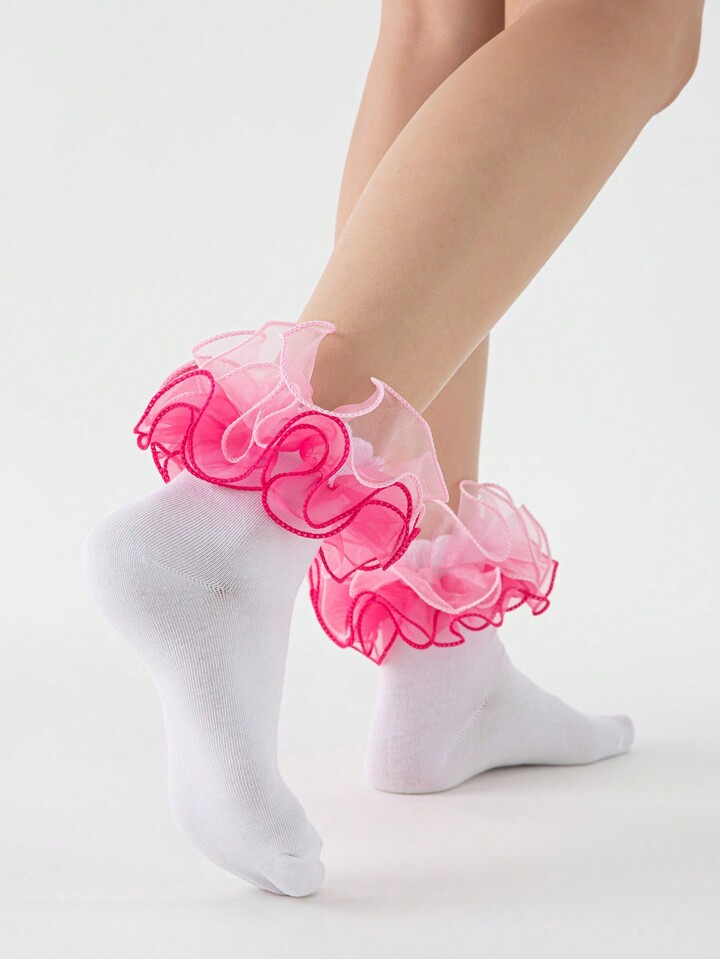 Kawaii Women's Contrast Color Mesh Ruffled Crew Socks