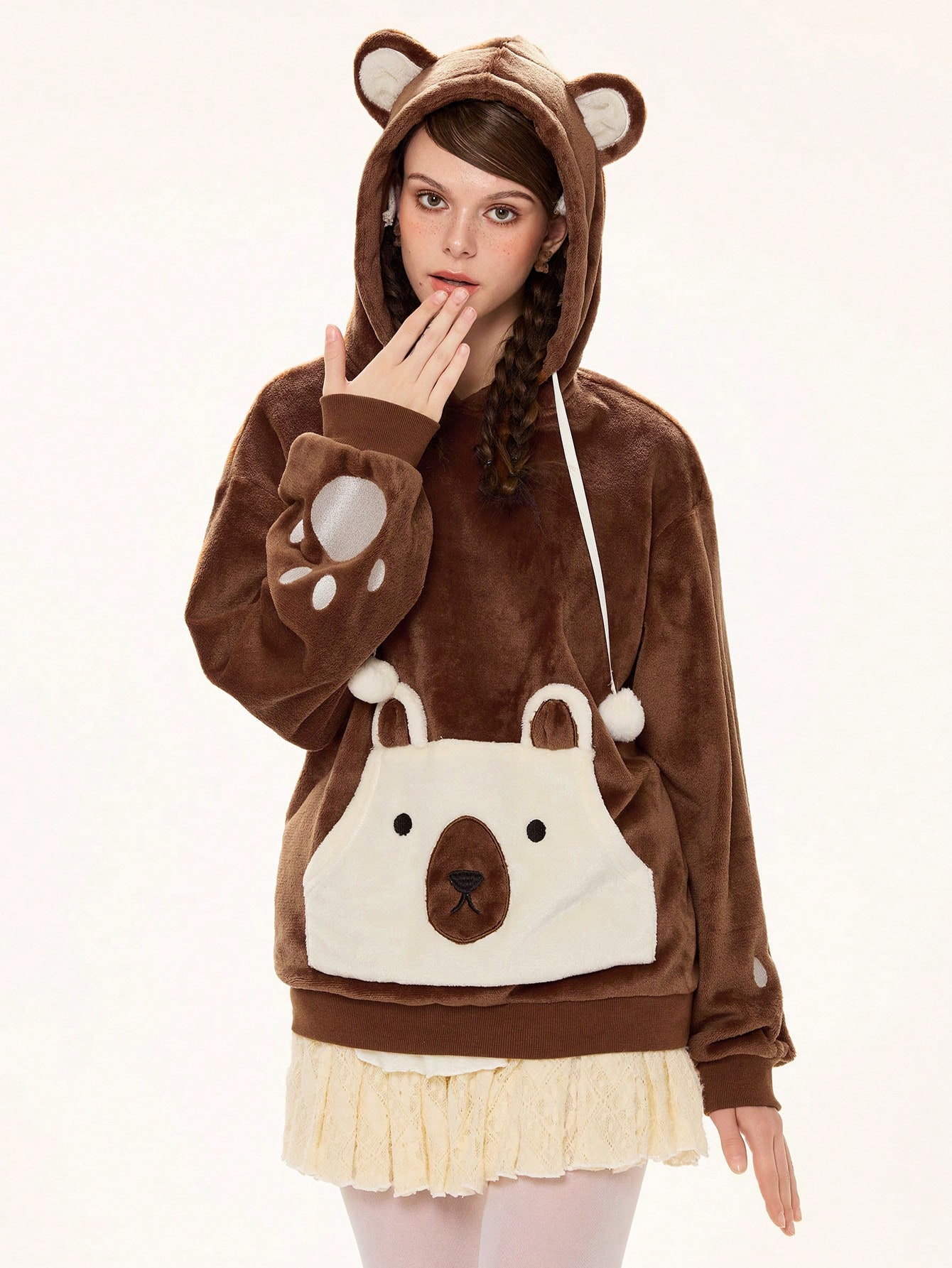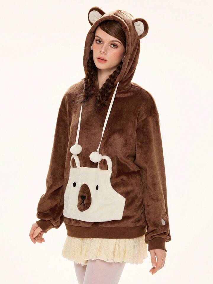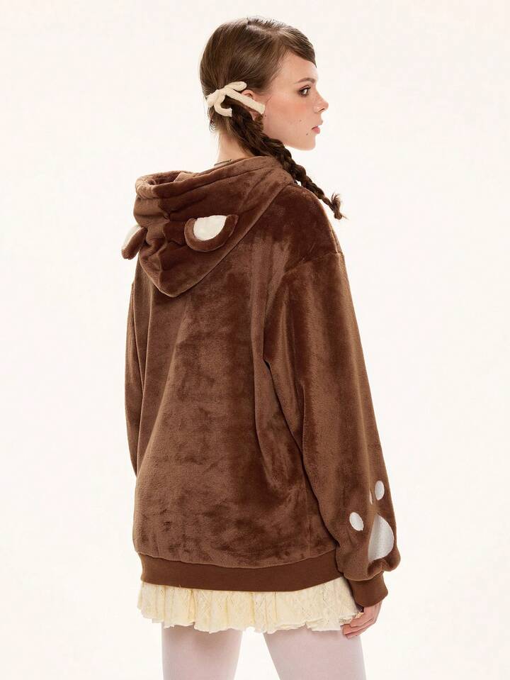 Kawaii Women's Cute Bear Ear Hoodie, Plush Fabric With Embroidered Bear Paw Design