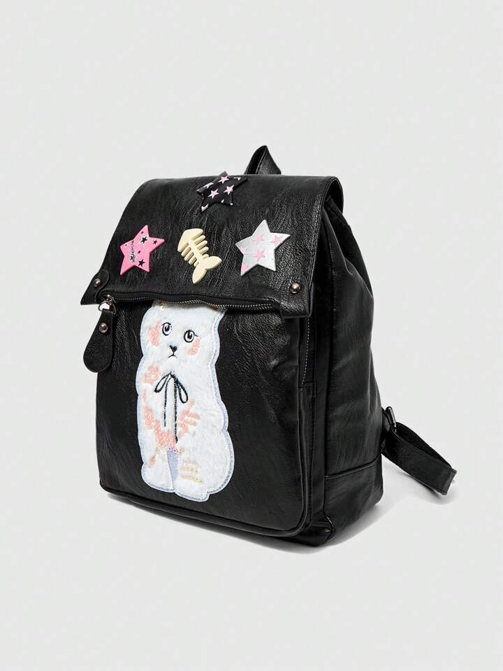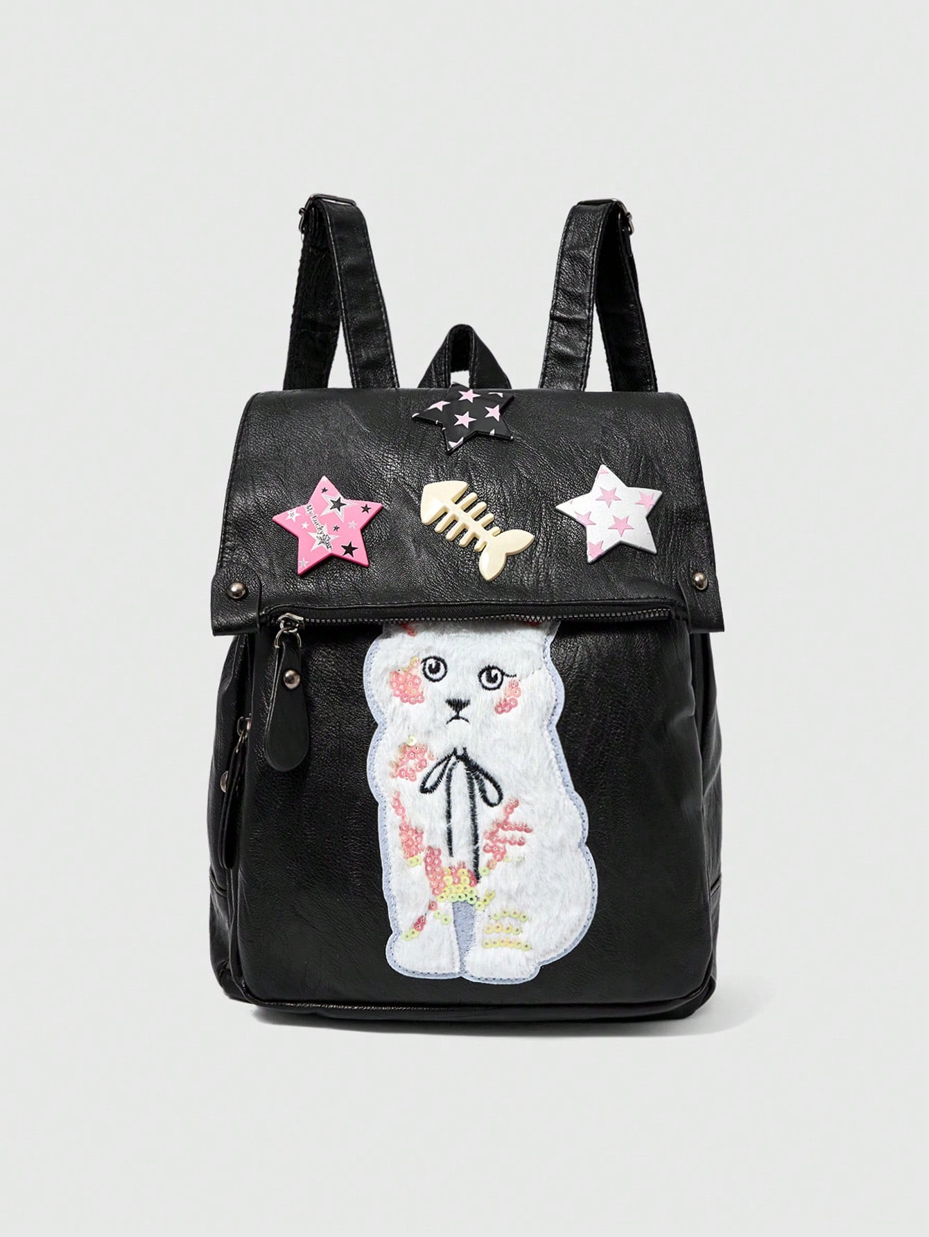 Kawaii Women's Cute Black Spacious Backpack With Plush Kitten, Stars & Fishbone Charms - Stylish School Bag For Teens, Large Capacity Travel Rucksack For College Campus Daily Use