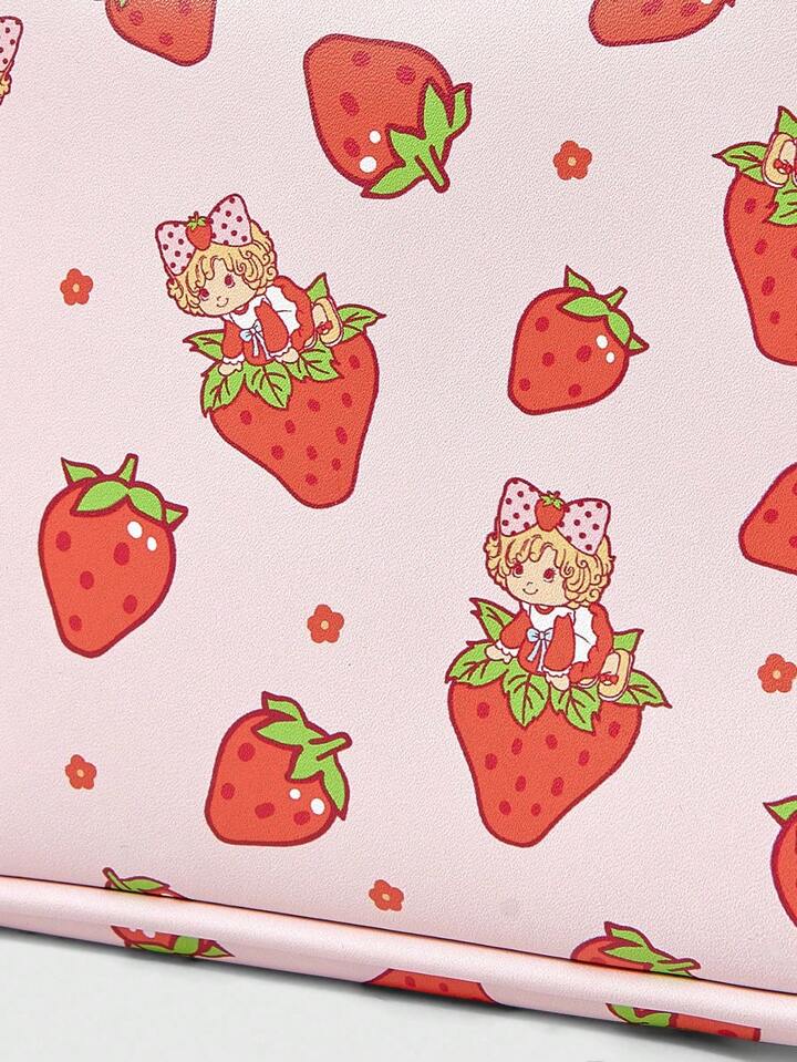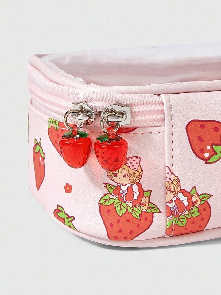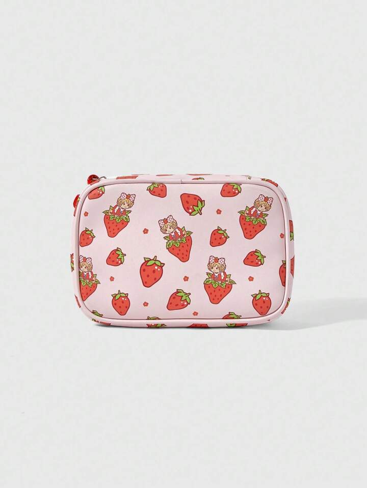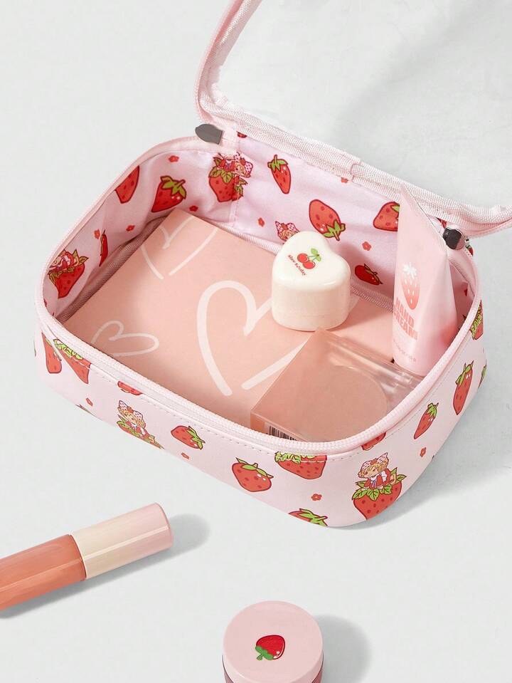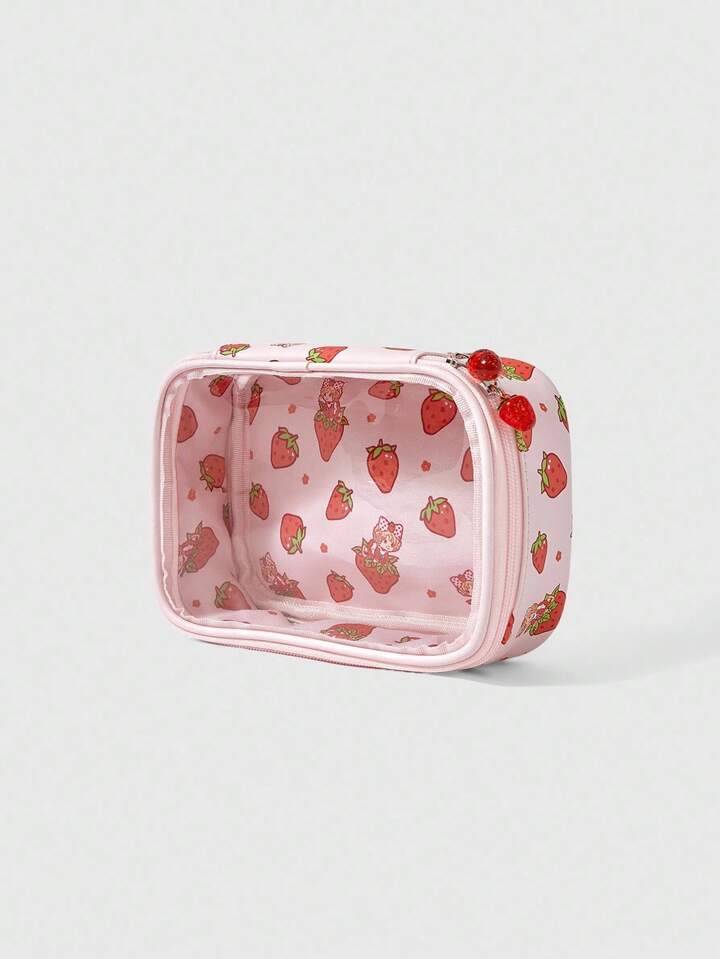 Kawaii Women's Pink Cute Strawberry Floral Print Transparent Patchwork Portable Toiletry Pouch